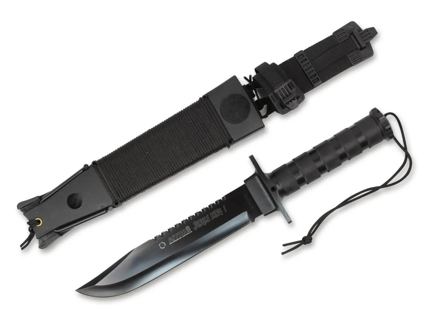 Das legendäre Aitor Jungle King I aus der beliebten Jungle King Messerserie wird von führenden Experten als eines der besten Überlebensmesser der Welt angesehen. Design, Vielseitigkeit und die kompromisslose Funktionalität des komplett schwarzen Messers trotzen jeder noch so unwirklichen Bedingung in der Natur. Die wuchtige Clippoint-Klinge aus MoVa ist mit Sägerücken ausgestattet und sorgt damit für maximale Flexibilität im Unterholz. Im Inneren des Edelstahlgriffs befindet sich ein umfangreiches Überlebens-Set mit Kompass, Angelset, Nähzeug, Pinzette, SOS-Signalpfeife, Pflaster sowie eine Skalpellklinge. Durchdacht zeigt sich ebenfalls die stabile Kunststoffscheide, die ein praktisches Skelettmesser als Backup beherbergt und mit dem mitgelieferten Gummischlauch als Steinschleuder umfunktioniert werden kann.