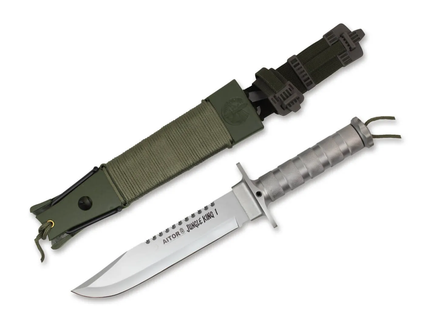 Das legendäre Aitor Jungle King I aus der beliebten Jungle King Messerserie wird von führenden Experten als eines der besten Überlebensmesser der Welt angesehen. Design, Vielseitigkeit und die kompromisslose Funktionalität trotzen jeder noch so unwirklichen Bedingung in der Natur. Die wuchtige Clippoint-Klinge aus MoVa ist mit einem Sägerücken ausgestattet und sorgt damit für maximale Flexibilität im Unterholz. Im Inneren des silbernen Edelstahlgriffs befindet sich ein umfangreiches Überlebens-Set mit Kompass, Angelset, Nähzeug, Pinzette, SOS-Signalpfeife, Pflaster sowie eine Skalpellklinge. Durchdacht zeigt sich ebenfalls die olivgrüne und stabile Kunststoffscheide, die ein praktisches Skelettmesser als Backup beherbergt und mit dem mitgelieferten Gummischlauch als Steinschleuder umfunktioniert werden kann.