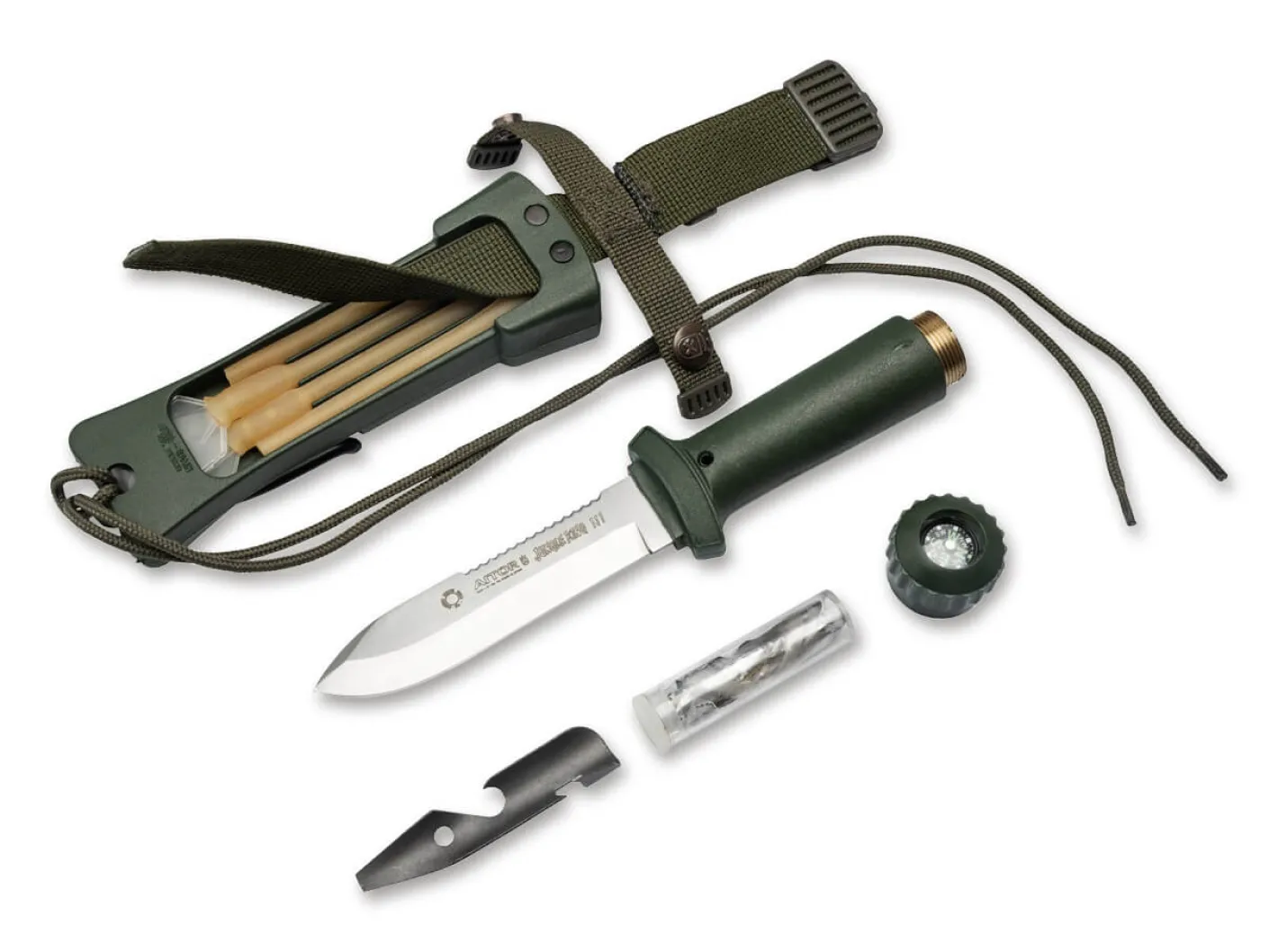 Der Jungle King III ist die kompakte Variante innerhalb der Jungle King Messerserie und richtet sich an begeisterte Bushcrafter und Outdoorfans. Design, Vielseitigkeit und die kompromisslose Funktionalität des Messers trotzen jeder noch so unwirklichen Bedingung in der Natur. Die Spearpoint-Klinge aus MoVa ist mit einem Sägerücken ausgestattet und sorgt damit für maximale Flexibilität im Unterholz. Im Inneren des leichten Polymergriffs befindet sich ein umfangreiches Überlebens-Set mit Kompass, Angelset, Nähzeug, Pinzette, SOS-Signalpfeife, Pflaster sowie eine Skalpellklinge. Durchdacht zeigt sich ebenfalls die stabile Kunststoffscheide, die mit dem mitgelieferten Gummischlauch als Steinschleuder umfunktioniert werden kann.