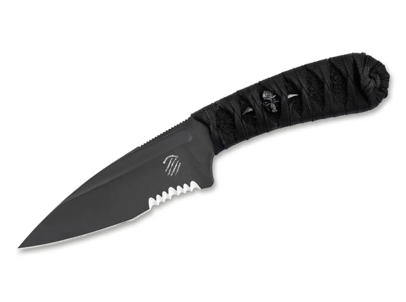 Wahrlich eine Sünde wert ist das kraftvolle Bastinelli Sin mit einer Wharncliffe-Klinge aus N690, gehalten im Black-Stonewash-Finish, sowie einer Paracord Griffumwicklung im Tsuka Stil mit eingefasstem, bronzefarbenem Totenkopf. Lieferung mit passgenauer Kydexscheide.