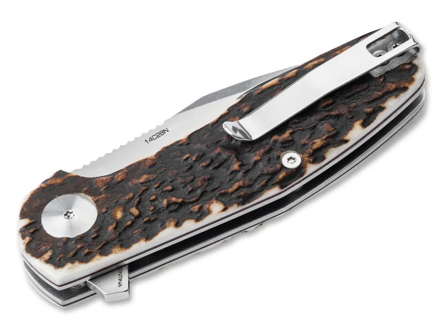 Die Mission: den stressigen Alltag mit verdienter Auszeit verfeinern. Die Anforderung: Charakter! Eine heldenhafte Aufgabe, derer sich das Böker Arbolito Heroína (span. Heldin) unerschrocken annimmt und als vielseitiges Taschenmesser die Bereiche EDC, Natur und Jagd heroisch in Einklang bringt. Die imposante Klinge aus schnitthaltigem 14C28N öffnet geschmeidig weich per Flipper und wird durch den felsenfesten Liner-Lock arretiert. Für den traditionellen Moment sorgen die Griffschalen aus ausgesuchtem Hirschhorn, während sich die opulente Abdeckung der Klingenachsschraube mit dem weltbekannten Böker Baum harmonisch ins Gesamtbild einfügt. Mit Tip-Up Clip (r), der eine Deep-Carry-Trageweise erlaubt.