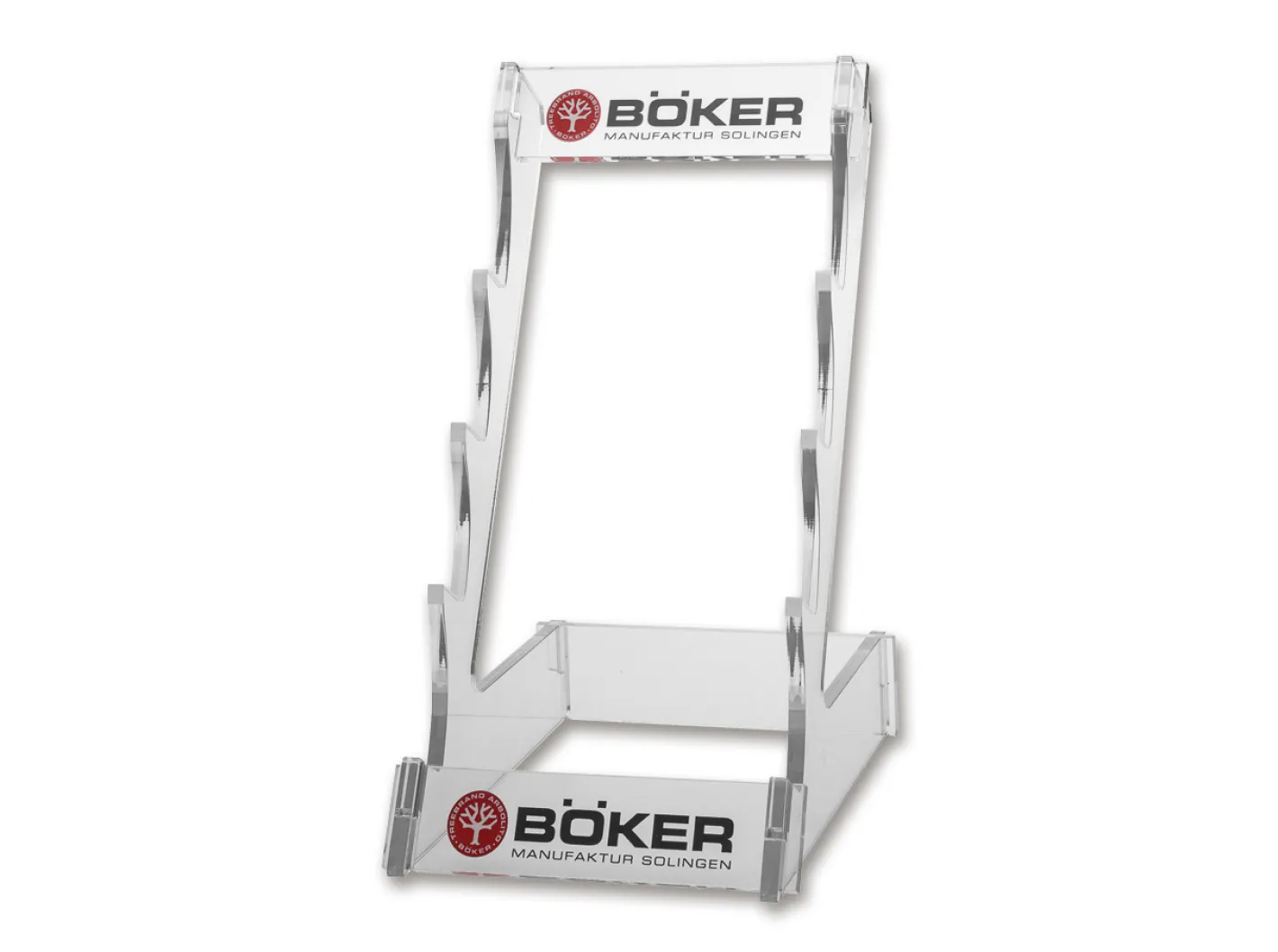 Acryl-Messerständer mit Böker Aufdruck für bis zu vier Fahrtenmesser. Breite 14,5 cm. Höhe 26 cm.