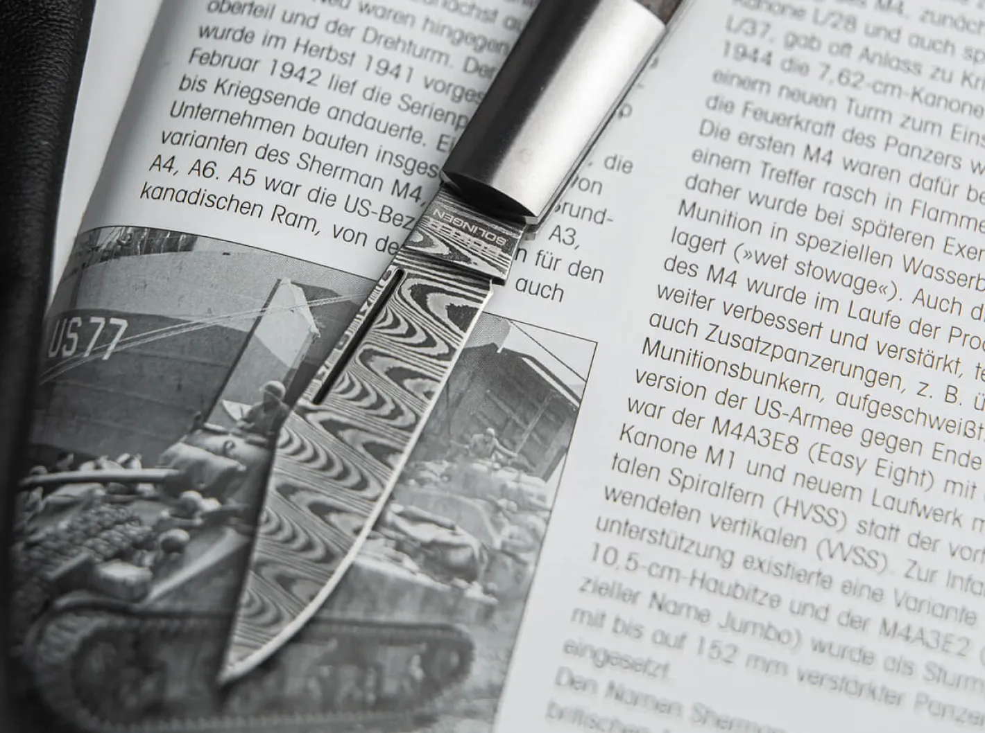 Die weltweite Begeisterung für unser einzigartiges Böker M4 Sherman-Damast hat uns schnell davon überzeugt, auch ein klassisches Modell mit dem geschichtsträchtigen Damaststahl zu entwerfen. Das traditionelle Böker Barlow ist im Vergleich zum Ursprungsmodell deutlich kompakter und macht nicht nur in der Messer-Vitrine eine besonders gute Figur, sondern überzeugt als hosentaschentaugliches Gentlemanmesser auch im Alltag. Die Klinge besteht aus dem unvergleichlichen Sherman-Damast, wird per Nagelhau geöffnet und verriegelt nicht. Die Bediensicherheit des geschichtsträchtigen Slipjoint-Taschenmessers wird durch eine 90 Grad Rastung beim Öffnen und Schließen zusätzlich erhöht. Die auffällige Tropfenform des Barlow lässt sich bis zu den englischen Taschenmessern des 17. Jahrhunderts zurückverfolgen, womit es sicherlich zu den ältesten Modellen überhaupt zählt. Der Name des Klassikers geht wahrscheinlich auf einen gleichnamigen, geschäftstüchtigen Messerproduzenten aus Sheffield zurück, der um 1800 begann, die robusten Messer nach Nordamerika zu exportieren. Dort erfreuten sie sich auf Anhieb sehr großer Beliebtheit und so erschienen zum Ende des 19. Jahrhunderts auch in der Historie der Böker Manufaktur die ersten Barlow Modelle.Der amerikanische M4 Sherman wurde bereits im Jahr 1940 entworfen und gilt bis heute als einer der berühmtesten Panzer der Geschichte. Er wurde zwischen 1942 und 1945 produziert, bis 1957 in Dienst gestellt und auf allen Kampfschauplätzen des Zweiten Weltkriegs eingesetzt – nicht nur von den Vereinigten Staaten und Kanada, sondern auch von Großbritannien, den Freien Französischen Streitkräften, China und sogar der Sowjetunion. Der Sherman wurde knapp 50.000-mal gebaut und ist der am häufigsten eingesetzte Panzer der Alliierten im Zweiten Weltkrieg. Er wurde in unzähligen einsatzspezifischen Variationen gefertigt und bis weit in den Kalten Krieg hinein genutzt. Gemeinsam mit dem Americans in Wartime Museum in Virginia haben wir es geschafft, ein wichtiges Stück verschwundener Geschichte zu bewahren.Das Böker Barlow M4 Sherman-Damast ist mit einer einzigartigen Damastklinge ausgestattet, die aus verschiedenen Materialien aus der Produktion von M4 Sherman-Panzern geschmiedet wird, die zuvor vom Museum restauriert wurden. Der einzigartige Damast aus 80 Lagen wird für uns von Hand von Chad Nichols im Muster Customized Ladder geschmiedet und erinnert an die Panzerspuren, die von den schweren Ketten des M4 Sherman im Boden zurückbleiben. Das in Integralbauweise ausgeführte Barlow ist mit Griffschalen aus Jute Micarta versehen, die farblich an die authentische Tarnlackierung der U.S. Army und dem Marine Corps erinnern. Die aus dem Vollen CNC-gefrästen Hefte aus rostfreiem Stahl bilden gleichzeitig die charakteristischen Backen und werden von Hand matt geschliffen. Mit hochwertigem Filz-Etui zur Aufbewahrung, Echtheitszertifikat und individueller Seriennummer. Handgefertigt in der Böker Messer-Manufaktur Solingen.
