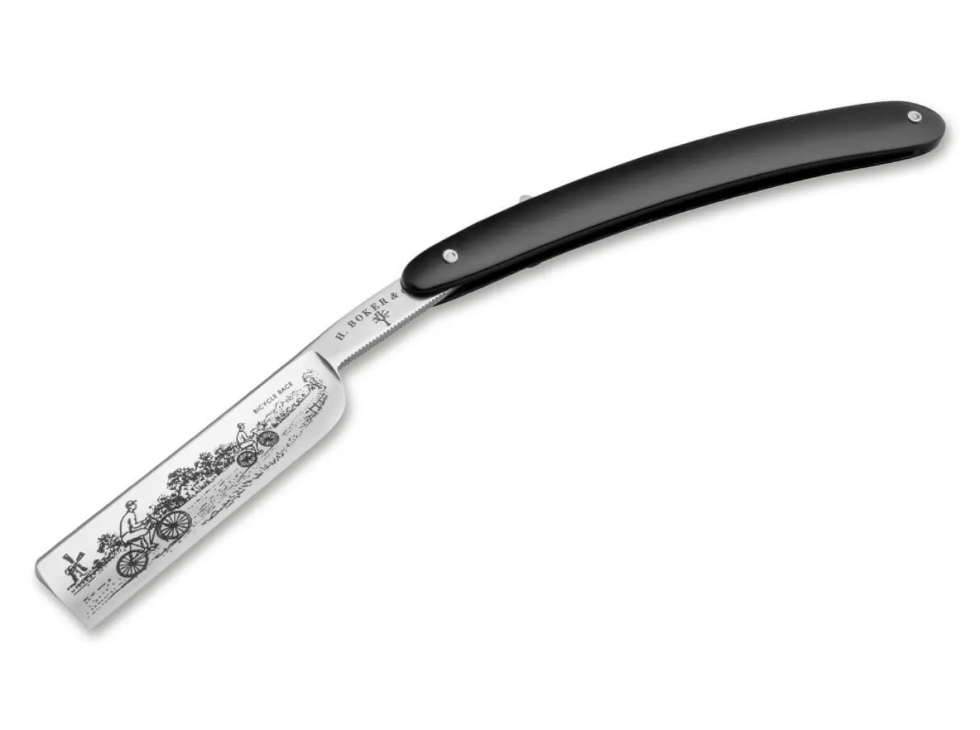 Noch bevor sich die Tour de France als bedeutendstes Radrennen der Welt etablieren konnte, quälten sich die einstigen Helden auf zwei Rädern über grobes Kopfsteinpflaster, staubige Schotterpisten und teils kurze und giftige Anstiege. Stahlrahmen, Baumwolltrikot, Casquette, nur ein Gang aber dafür ein heldenhafter Schnurrbart waren die übliche Ausstattung, mit der es auf die unbarmherzigen 250 km der klassischen Eintagesrennen ging. Aus diesem nostalgischen Zauber heraus entstanden die fünf Monumente des Radsports, die bis heute zahlreiche Radsportanhänger begeistern. Die ersten dieser traditionsreichen Eintagesklassiker fanden Ihren Ursprung in Belgien und Frankreich bereits vor 1900 und brachten den Siegern Ruhm und Ehre ein.Böker holt ein Stück Geschichte zurück und präsentiert das Böker Bicycle Race als Neuauflage des um 1900 erschienenen gleichnamigen Rasiermessers. Die Klinge des weltweit auf 300 Exemplare limitierten Sondermodells zeigt nach historischem Vorbild ein klassisches Radrennen in malerischer Landschaft. Dabei füllt das aufwendig restaurierte und in mehreren Schichten gelaserte Motiv fast die komplette Klinge aus, während das historische H. Boker & Co Logo den Klingengang ziert.Die 5/8 Zoll breite Klinge aus widerstandsfähigem Kohlenstoffstahl ist mit einem Gradkopf versehen und steht für die Vielseitigkeit, Robustheit und Geradlinigkeit jener klassischen Fahrräder, die mit einer festgelegten Ausstattung für alle Terrains gewappnet sein mussten – das Böker Bicycle Race steht dem in puncto Rasur also in nichts nach. Das edle Satin Finish und die einseitige Serrierung runden das heldenhafte Profil des Rasiermessers ab. Der ballige Griff aus schwarzem Kunststoff würde zeitgenössisch mit zwei Nieten aus Neusilber veredelt. Lieferung mit Echtheitszertifikat und historischer Verpackung. Handgefertigt in der Böker Messer-Manufaktur Solingen.
