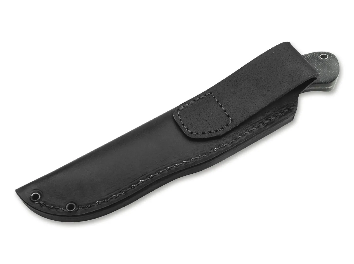 Das von Kosie Steenkamp entworfene Böker Drikas ist in der Outdoor-Variante mit einer dunklen Klinge aus N690 ausgestattet, die mit einem widerstandsfähigem Acid-Wash-Finish versehen ist. Das aufwendige Filework am Klingenrücken ist nicht nur ein besonders dekoratives Element, sondern kann auch als Daumenauflage genutzt werden und erhöht somit die Griffsicherheit. Auch die konturierten Griffschalen aus schwarzem Micarta sind für den Einsatz in der Wildnis oder auf der Jagd bestens geeignet und liegen dank der feinen Texturierung stets sicher in der Hand. Mit Fangriemenöse und praktischer Köcherscheide aus hochwertigem Leder. Handgefertigt in der Böker Messer-Manufaktur Solingen.