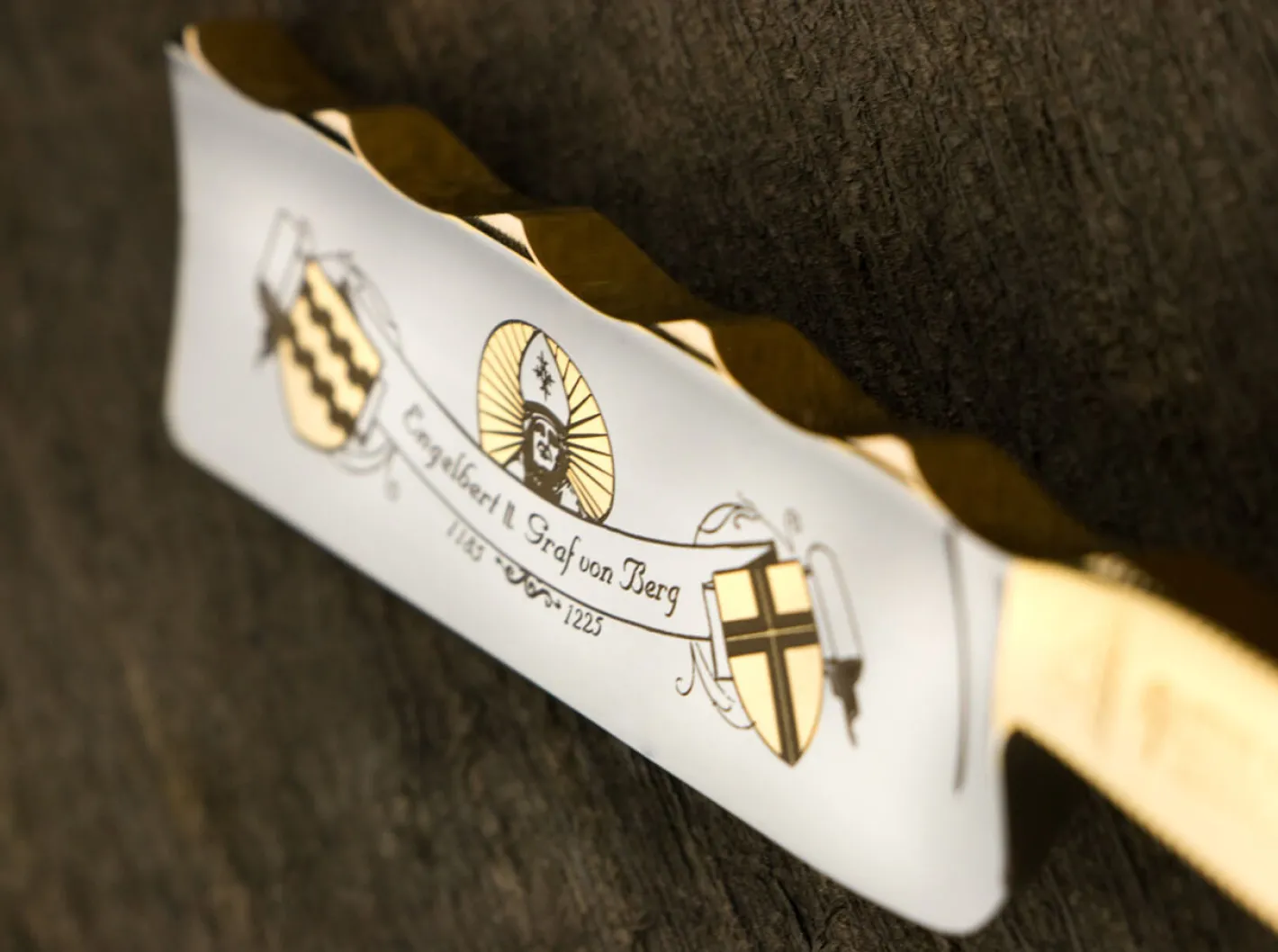 Unweit vom Firmensitz der Böker Manufaktur in Solingen befindet sich mit Schloss Burg an der Wupper das Wahrzeichen des Bergischen Landes. Sie ist zugleich eine der größten Burgen Westdeutschlands und die größte rekonstruierte Burganlage in Nordrhein-Westfalen. Die ruhmreiche Geschichte von Schloss Burg ist untrennbar mit dem Herzogtum Berg und den Grafen von Berg (Haus Berg 1068-1225) verbunden. Dies haben wir zum Anlass genommen, um den drei Grafen von Berg eine Rasiermesserserie zu widmen, welche Teile des Lebens der drei Grafen symbolisiert und mit beeindruckenden Verzierungen aus 24 Karat Gold an die beträchtlichen Besitztümer und den Machteinfluss der Grafen erinnert.Der letzte Graf von Berg, Engelbert II., wurde auch Engelbert I., Erzbischof von Köln genannt. Mit seiner Ermordung ging Berg an das Haus Limburg über. Dieses prunkvolle Rasiermesser in 7/8 Zoll zeigt Engelbert als Erzbischof von Köln. Der Gradkopf dieser auf Klang ausgeschliffenen Klinge aus bestem Solinger Rasiermesserstahl und der geschwungene Klingenrücken in Kombination mit einem Heft aus feinstem Horn dokumentieren höchste Eleganz und einzigartige Qualität. Die Klinge wird extrahohl mit Wall geschliffen. Inklusive Echtheitszertifikat und edlem Präsentationsdisplay mit individueller Seriennummer.