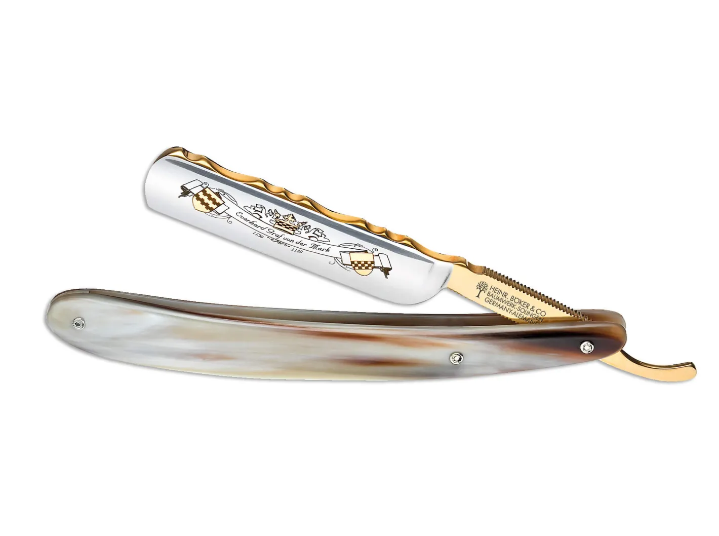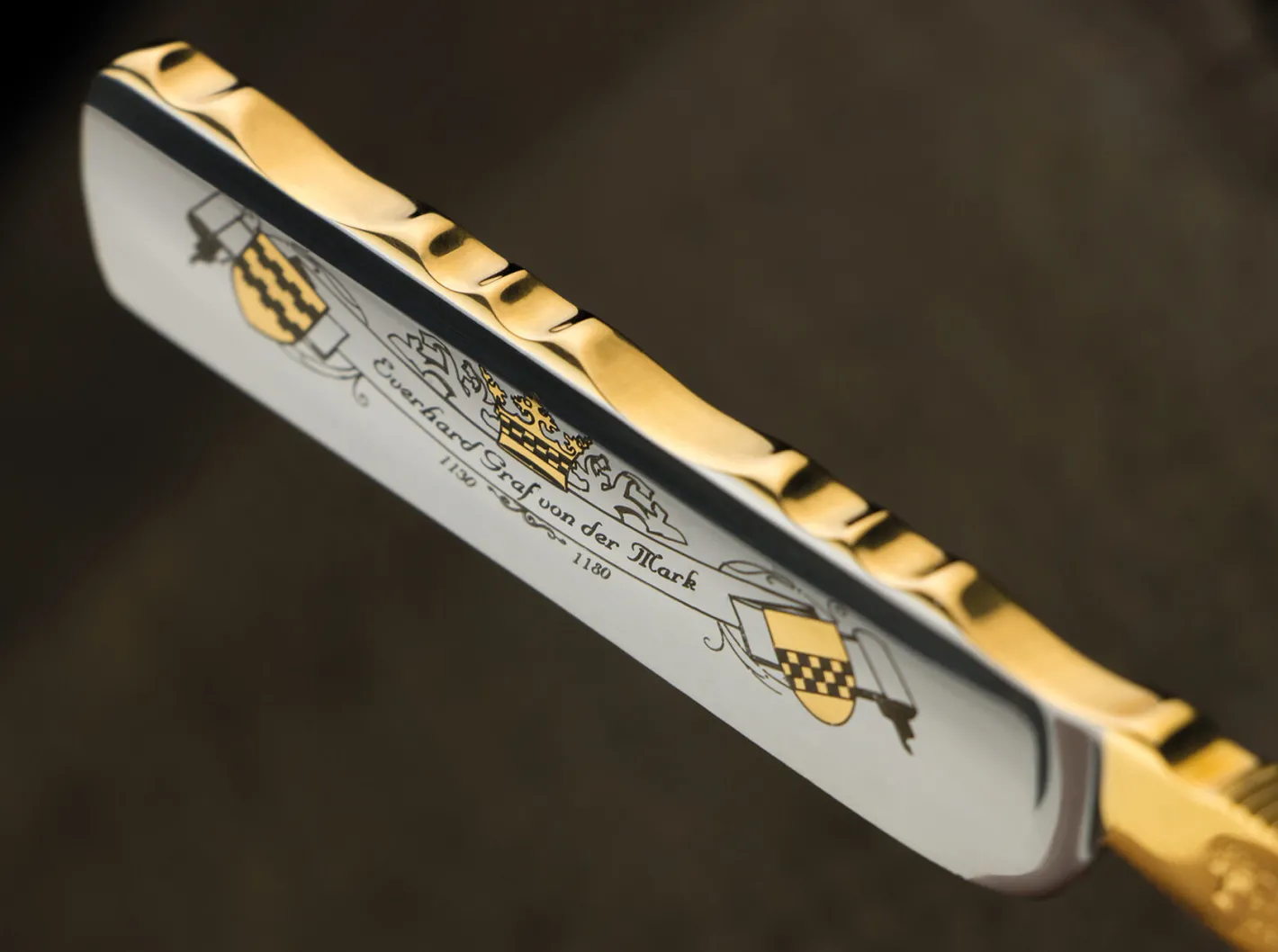 Unweit vom Firmensitz der Böker Manufaktur in Solingen befindet sich mit Schloss Burg an der Wupper das Wahrzeichen des Bergischen Landes. Sie ist zugleich eine der größten Burgen Westdeutschlands und die größte rekonstruierte Burganlage in Nordrhein-Westfalen. Die ruhmreiche Geschichte von Schloss Burg ist untrennbar mit dem Herzogtum Berg und den Grafen von Berg (Haus Berg 1068-1225) verbunden. Dies haben wir zum Anlass genommen, um den drei Grafen von Berg eine Rasiermesserserie zu widmen, welche Teile des Lebens der drei Grafen symbolisiert und mit beeindruckenden Verzierungen aus 24 Karat Gold an die beträchtlichen Besitztümer und den Machteinfluss der Grafen erinnert.Der auffallend geschliffene und vergoldete Klingenrücken der hochglanzpolierten Klinge in 5/8 Zoll ist ein absolutes Highlight im Böker-Sortiment. Die mit 24 Karat Gold veredelten Elemente der Klingenätzung erinnern mit dem Wappen der Stadt Hamm an den Herrschaftsbereich des Grafen Everhard von der Mark, der dem Hause Berg entstammt. Der Erl, der mit einem Rundkopf versehenen Klinge, ist mit einer beidseitigen Serrierung ausgestattet. Die Klinge wird extrahohl mit Wall geschliffen. Auslieferung im edlen Präsentationsdisplay mit Echtheitszertifikat und individueller Seriennummer.