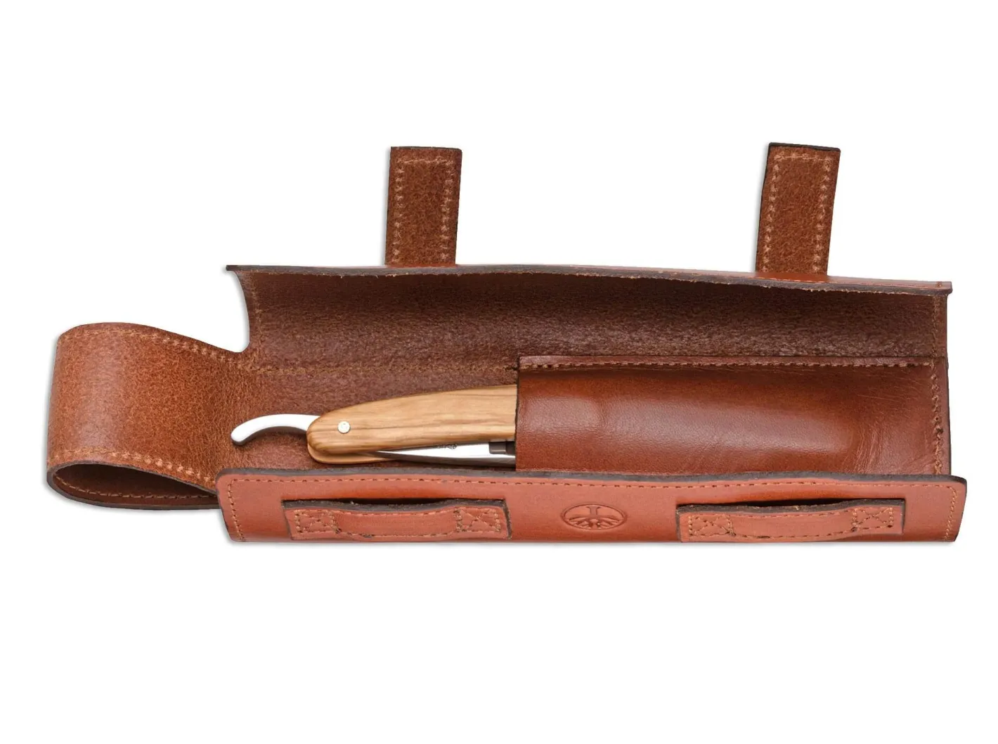 Das klassische Rolletui aus echtem Leder bietet den hochwertigen Messern aus der Böker Manufaktur den perfekten Schutz beim Transport auf Reisen. Das Täschchen ist mit zwei parallel verlaufenen Lederlaschen sicher zu verschließen und bietet allen Rasiermessern in den üblichen Größen zwischen 4/8“ und 7/8“ ausreichend Platz. Bitte beachten Sie, dass es bei nicht rostfreien Kohlenstoffstahlklingen sinnvoll ist, das Rasiermesser im Etui zum Beispiel durch eine zusätzliche Lage Ölpapier zu schützen, um einen direkten Kontakt der Klinge mit dem Leder und dessen Gerbsäuren und die dadurch mögliche Korrosion zu vermeiden. Lieferung ohne Rasiermesser. Innenmaße: 17 x 3,4 x 1 cm.