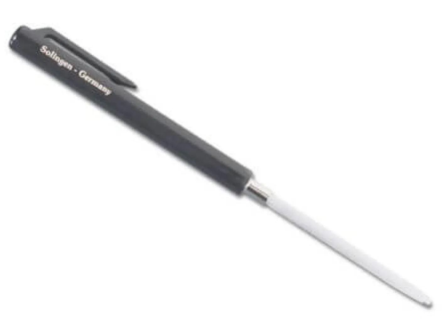 Der handliche Böker Taschenwetzstahl passt bequem in jede Tasche und lässt sich teleskopartig ausziehen. Eingefahren ist er nur 11,4 Zentimeter lang. Mit praktischem Clip.