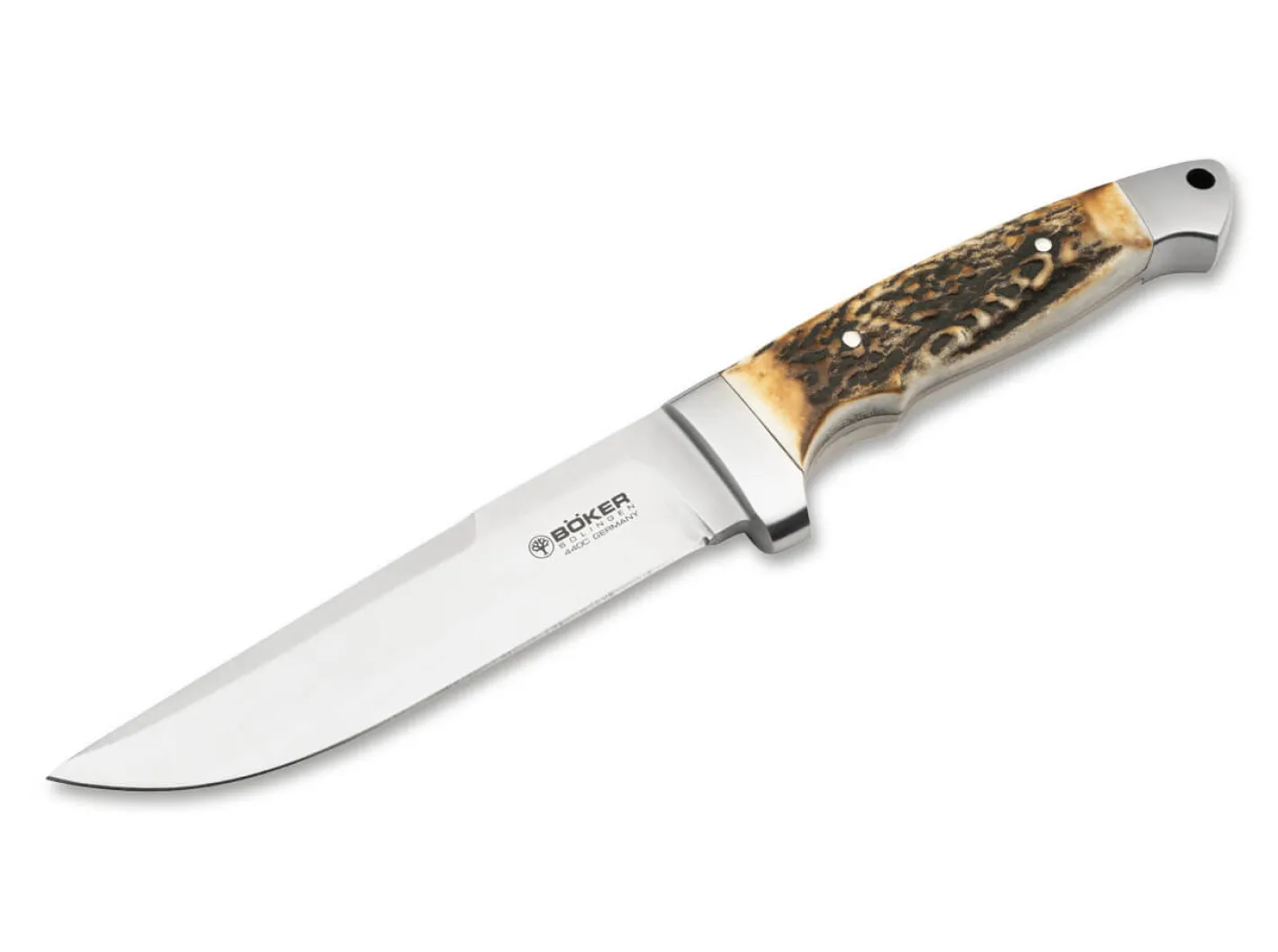 Das Böker Vollintegral XL ist der große Bruder des seit vielen Jahren bewährten Vollintegral und kommt dem oft an uns herangetragenen Wunsch nach einer größeren Version entgegen. Mit seiner beeindruckenden Klinge aus eisgehärtetem 440C mit 58 bis 59 HRC eignet sich das Vollintegral auch für stärkeres Wild, sei es in Nordeuropa oder in Übersee. Sie ist mit einem Flachschliff versehen, der die Stabilität der Klinge maximiert. Das aus einem Stück Stahl im Gesenk geschmiedete Messer ist mit aufwendig konturierten Griffschalen aus handverlesenem Hirschhorn versehen, die schon allein aufgrund der enormen Größe des Messers eine absolute Besonderheit darstellen. Das klassische Naturmaterial wird in der Regel in deutlich kleineren Kanteln verarbeitet und ist in dieser Größe nur äußerst schwer zu finden. Lieferung mit hochwertiger Lederscheide. Handgefertigt in der Böker Messer-Manufaktur Solingen.