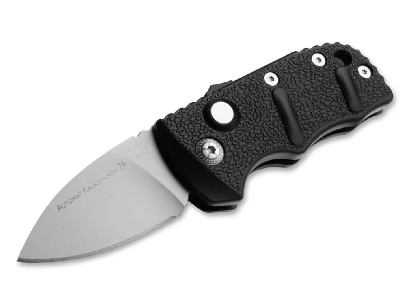 Hinweis: Seit dem 31.10.2024 gilt in Deutschland ein generelles Umgangs- und Besitzverbot von Springmessern aller Art. Es handelt sich ab sofort um verbotene Gegenstände, deren Besitz strafbar ist. Der Besitz von bestimmten Springmessern ist gem. Anlage 2 zum Waffengesetz Abschnitt 1 Nummer 1.4.1 nur noch Personen erlaubt, bei denen ein berechtigtes Interesse besteht, das eine einhändige Nutzung erforderlich macht (etwa aufgrund eines fehlenden Arms oder einer fehlenden bzw. dysfunktionalen Hand), oder der Umgang im Zusammenhang mit der Berufsausübung (z.B. Jagd, Handwerk) oder dem Sport (z.B. Segeln oder Bergsteigen) erfolgt. Gleiches gilt für gewerbliche Händler oder Hersteller solcher Messer. Die Abgabe erfolgt daher nur noch an berechtigte Personen. Bitte prüfen Sie vor der Bestellung, ob ein solches berechtigtes Interesse bei Ihnen vorliegt.Dass ein kleines Messer nicht immer zierlich sein muss, ist sicher keine neue Erkenntnis. Aber dass das Böker Plus AKS-74 als Stubby zwischen der Standardgröße und den Mini-Modellen eine so gelungene Brücke schlägt, hat uns selbst überrascht. Mit einer Ergonomie, die auch größeren Händen oder bei kraftvollerem Einsatz maximale Kontrolle bietet, ist das Plus AKS-74 Stubby die erste Wahl für alle, die viel Power und Kompaktheit an einem Messer zu schätzen wissen. Die handlichen Abmaße erlauben es, mit einer nur minimal gekürzten D2-Klinge eine Version anzubieten, die auch dem aktuellen Schweizer Waffenrecht entspricht. Dieses erlaubt Springmesser nur mit einer Gesamtlänge bis zwölf Zentimeter bei maximal fünf Zentimeter Klingenlänge. Der EDP-beschichtete schwarze Griff aus Aluminium erinnert stark an das Bajonett des berühmten Sturmgewehrs, die erhabenen Strukturbahnen bieten zudem in jeder Situation sicheren Halt. Mit Fangriemenöse und praktischem Clip (Tip-up/r).