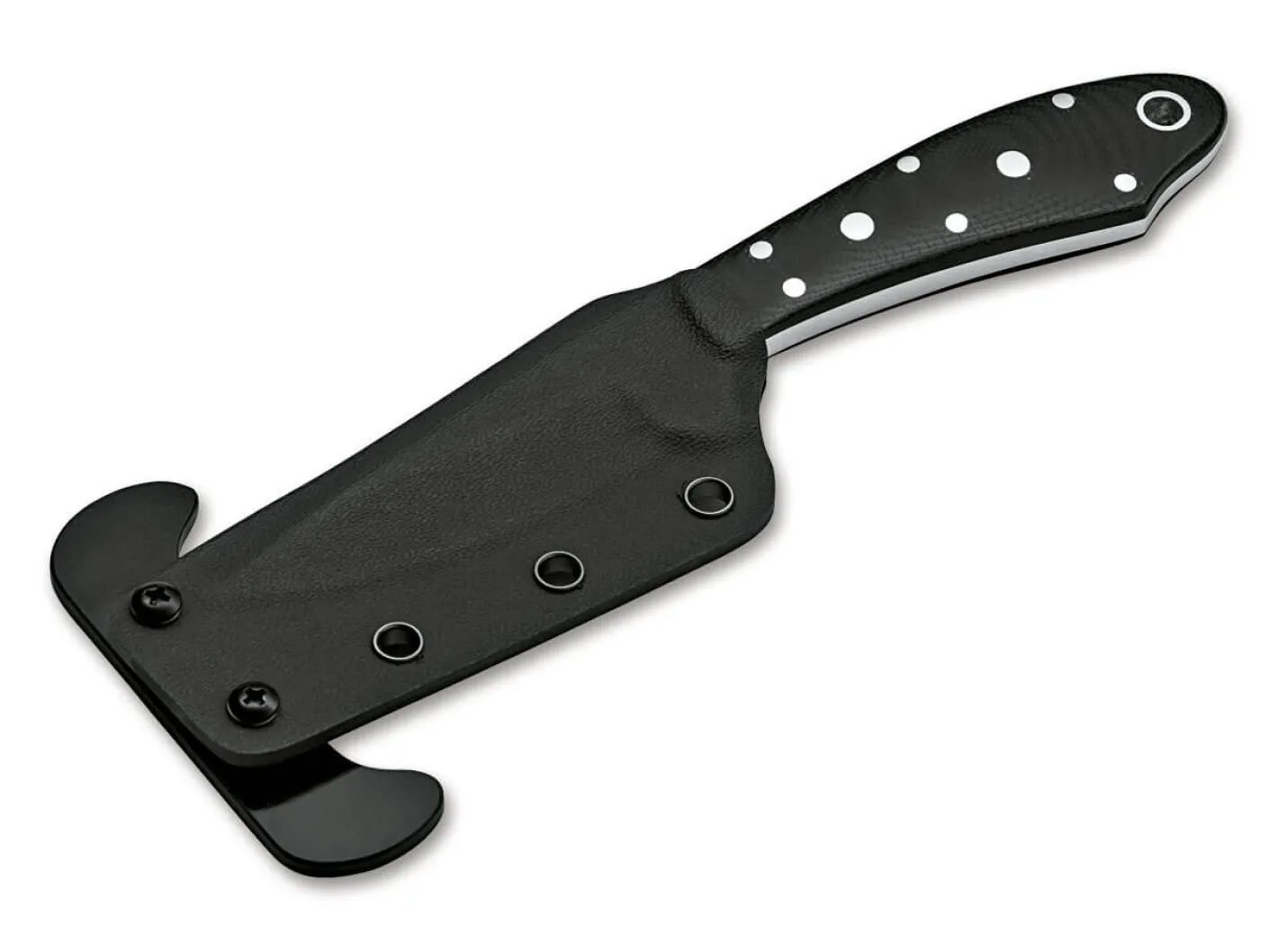 Der für seine ausgefallenen und innovativen Entwürfe bekannte Custom-Messermacher Mickey Yurco besitzt ein unvergleichliches Gespür für Ergonomie und außergewöhnliche Lösungen. Das Böker Plus Backdrop bildet da keine Ausnahme und überzeugt mit einem auf Geschwindigkeit und Flexibilität ausgelegten Konzept. Die passgenaue Kydexscheide kann mit dem beidseitigen Haken in der vorderen Hosentasche, mit der Lederplatte in der Gesäßtasche oder mit der Kugelkette als Neck Knife um den Hals getragen werden.Haken und Platte verhindern, dass die Scheide beim Ziehen des Messers ebenfalls aus der Tasche rutscht und gewährleisten so, dass das Messer stets einsatzbereit ist. Zudem lässt sich das frei mitführbare Backdrop dadurch genauso komfortabel und diskret tragen wie ein Klappmesser. Das handliche Backup-Messer ist mit einer satinierten Klinge aus D2 und Griffschalen aus schwarzem G10 ausgestattet, die mit dekorativen Nieten versehen sind. Die ergonomische Fingermulde und Riffelungen im Bereich der Daumenauflage erhöhen die Arbeitssicherheit. Mit verstärkter Fangriemenöse.