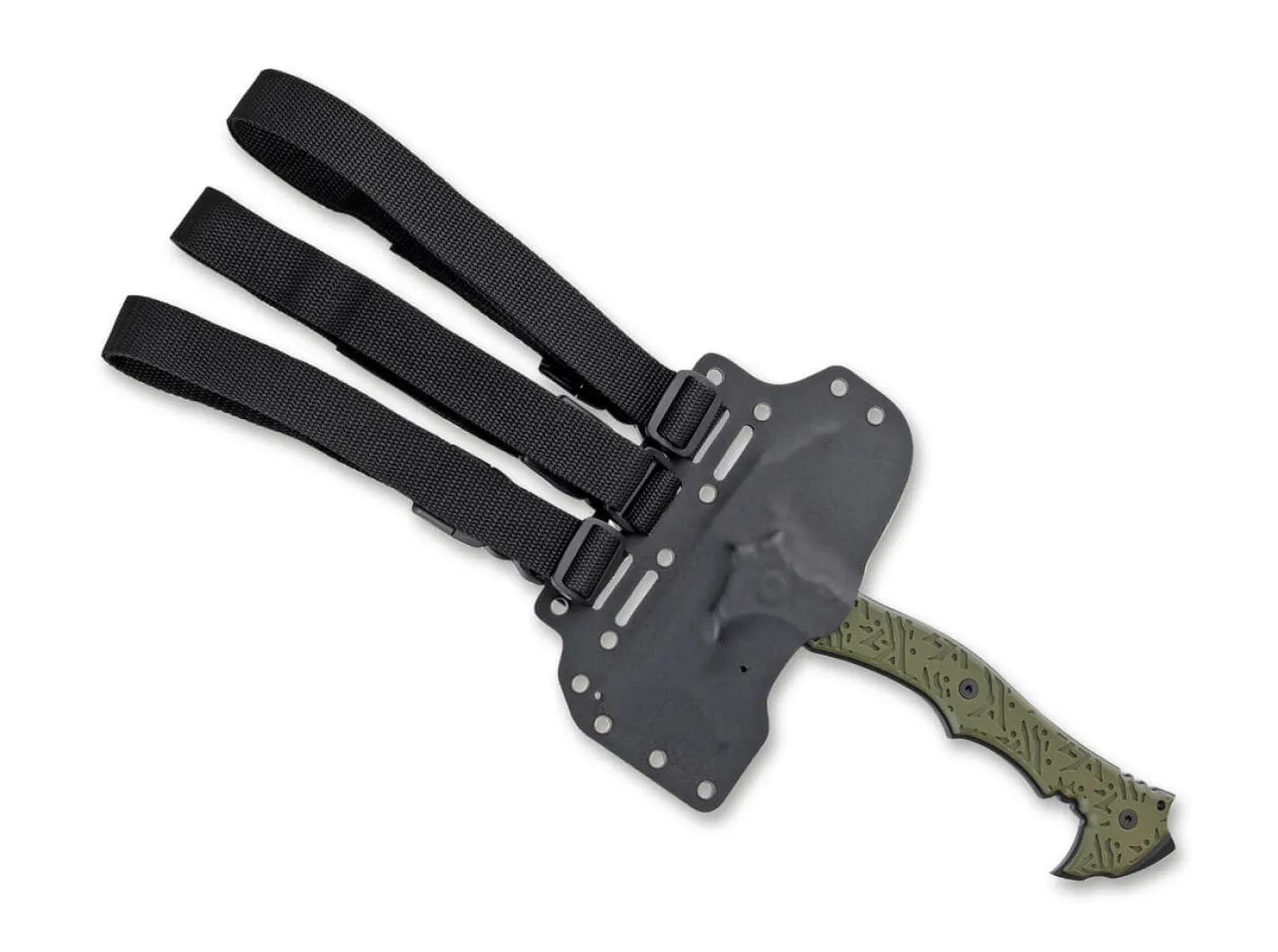 Das Böker Plus Chicken Hawk von DJ Urbanovsky ist für noch mehr Power mit dem nicht rostfreien SK-5 Kohlenstoffstahl ausgestattet. Dieser hat sich bereits in zahlreichen unserer Tomahawks bewährt und verleiht dem Chicken Hawk noch mehr Potential. Die schwarze Pulverbeschichtung erhöht den Korrosionsschutz. Das Chicken Hawk zeichnet sich vor allem durch seine extreme Kompaktheit aus, denn durch die Gesamtlänge von gerade einmal 23 cm ist es wesentlich vielseitiger hinsichtlich der Transport und Tragemöglichkeiten als ein Hawk klassischer Größe. Die im Lieferumfang enthaltene Kydexscheide lässt sich mit den ebenfalls mitgelieferten Gurten nicht nur am Gürtel oder der Ausrüstung, sondern auch unter der Achsel tragen. Der ergonomisch geformte Griff erlaubt nicht nur klassisches Hacken, sondern ermöglicht auch ein sicheres Vorgreifen für feinere Arbeiten, sei es zum Schnitzen, Schaben oder Schneiden. Für maximale Effektivität ist der Axtkopf auf der Oberseite bis zum Dorn ebenfalls abgezogen.