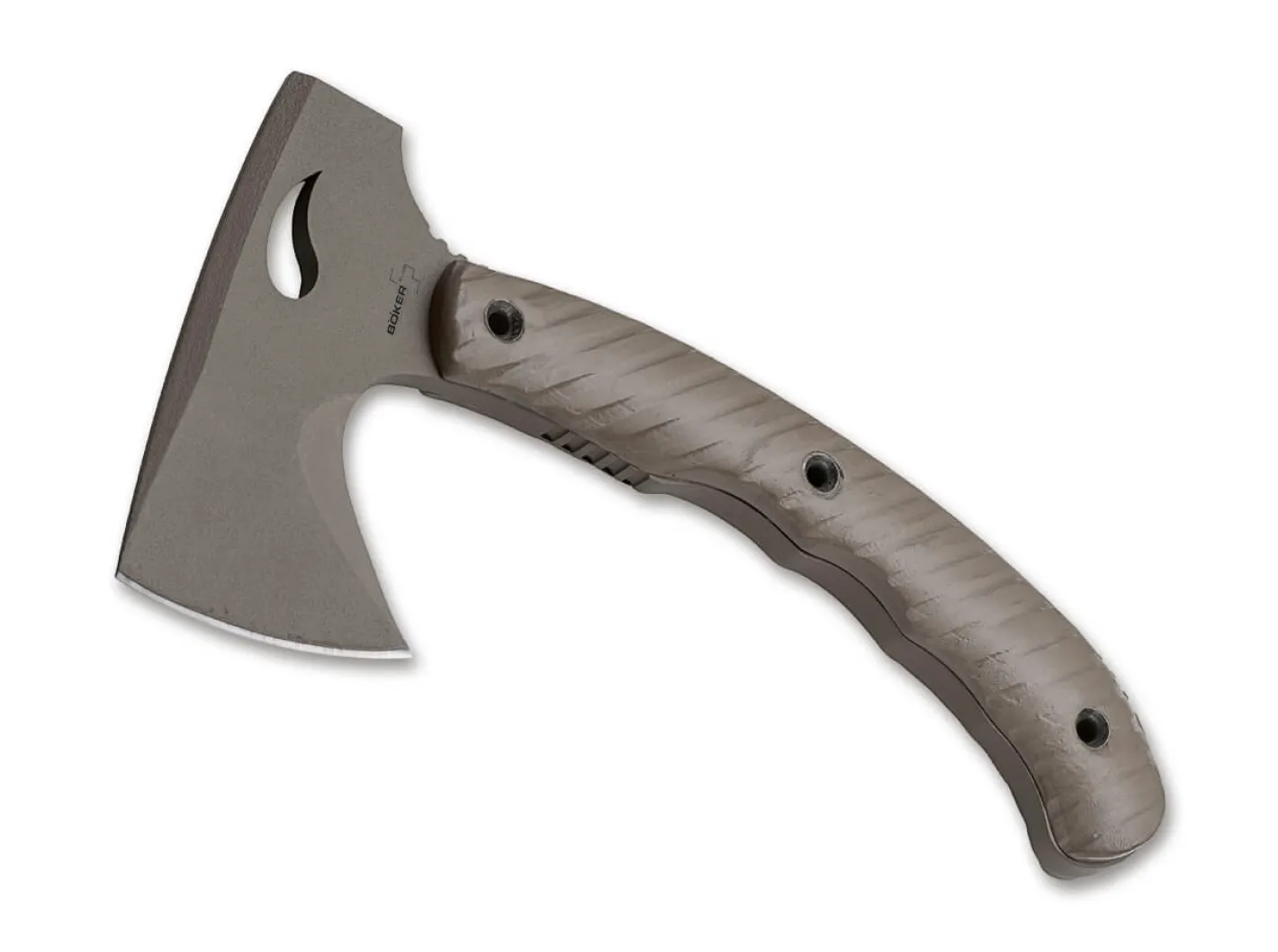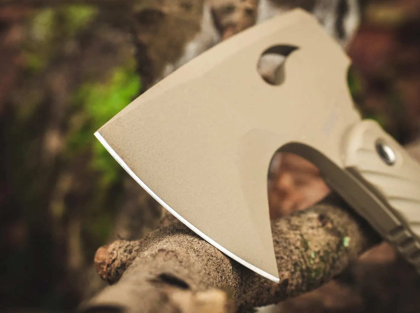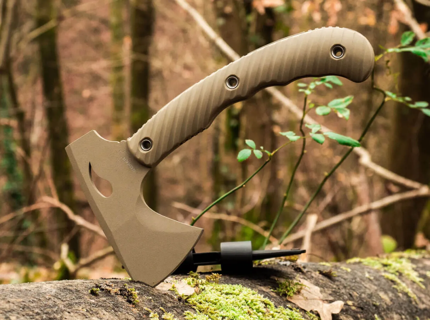 Das kompakte Escape Hawk von Peter Fegan zeigt eindrücklich, wie groß der Einfluss einer gelungenen Ergonomie auf die Leistung eines Werkzeuges ist. Die leicht gekröpfte Griffgestaltung des Escape Hawk entstand aus der Analyse biomechanischer Vorgänge beim Hacken und sorgt trotz der kompakten Abmaße für eine maximale Effektivität, die viele größere Werkzeuge übertrifft. Mit einer Basis aus SK5- Kohlenstoffstahl, der zum Schutz vor Korrosion pulverbeschichtet ist, wurde ein vor allem bei Tomahawks vielfach bewährter Stahl gewählt, der gerade hinsichtlich Schockbelastungen Außergewöhnliches leistet.Die strukturierten Griffschalen aus glasfaserverstärktem Kunststoff (FRN) geben maximalen Halt und Griffigkeit. Mit der rückwärtigen Hammerfläche erweitert sich das Einsatzspektrum als Notfallwerkzeug nochmals. Eine kompakte Kydexscheide ist im Lieferumfang enthalten. So stellt das Escape Hawk ein überaus gelungenes Einsatzwerkzeug dar, das gerade wegen seiner Kompaktheit überraschend gut mitgeführt werden kann, ohne die Ausrüstung in Gewicht oder Volumen über Gebühr zu belasten.