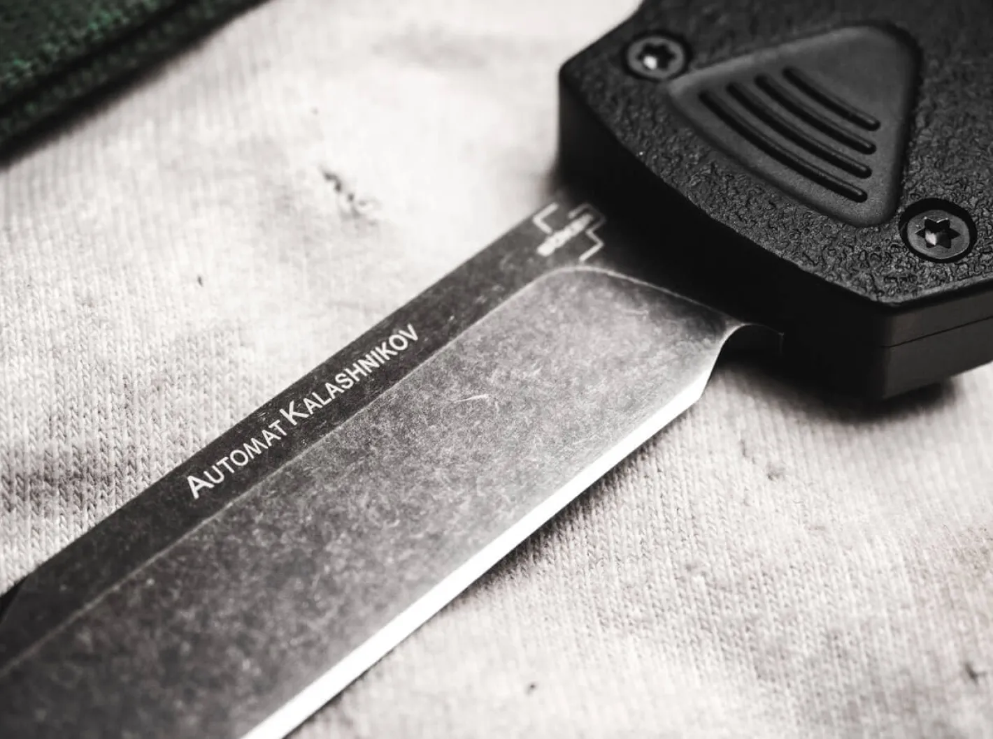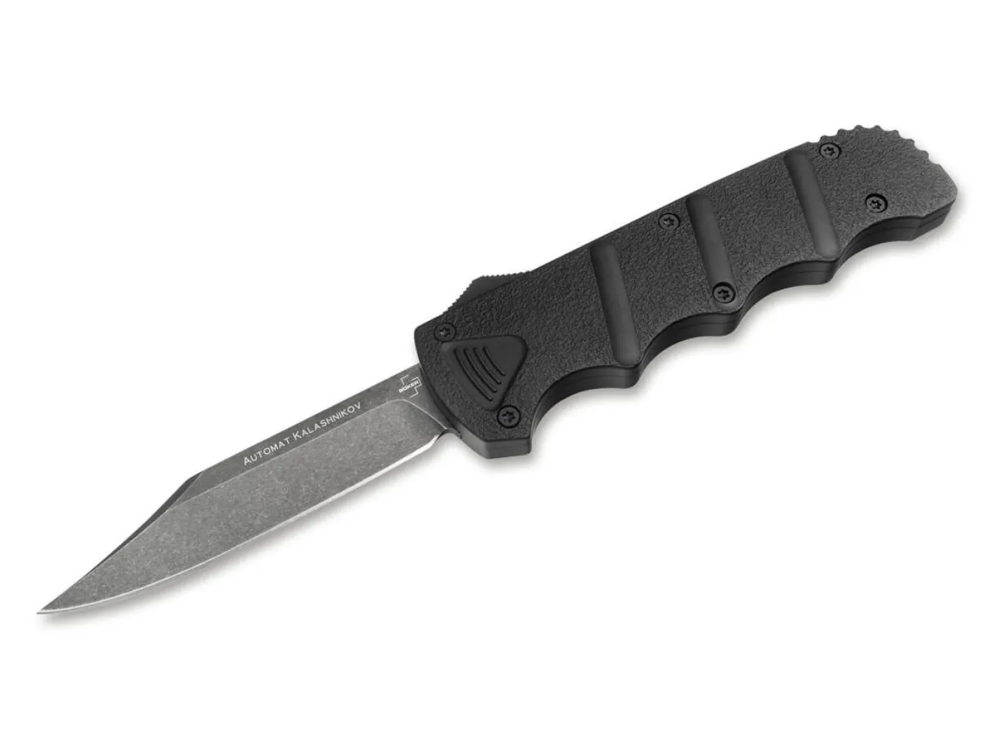 Achtung!Dieser Artikel ist ausschließlich für den Export in zugelassene Märkte bestimmt. Es handelt sich um einen verbotenen Gegenstand gemäß deutschem Waffengesetz. Der Vertrieb in und die Einfuhr nach Deutschland sowie jeglicher Umgang mit diesem Produkt in Deutschland ist verboten. Die Abgabe erfolgt nur an berechtigte Personen, jede Bestellung wird manuell geprüft! Bestellungen aus nicht zugelassenen Märkten werden ohne Rückmeldung gelöscht. Aufgrund der besonderen Rechtslage müssen wir diesen Artikel getrennt von anderen Artikeln versenden, wodurch höhere Portokosten entstehen können.Das robuste Böker Plus Kalashnikov OTF erweitert die beliebte Kalashnikov-Serie um ein modernes OTF. Der schwarze Griff aus Aluminium erinnert stark an das Bajonett des berühmten Sturmgewehrs, die erhabenen Strukturbahnen bieten zudem in jeder Situation sicheren Halt. Die mit einem dunklen Stonewash-Finish versehene Bowie-Klinge wird aus D2 gefertigt und lässt sich bequem über einen Schieber auf dem Griffrücken bedienen. Mit praktischem Deep-Carry-Clip (Tip-down).