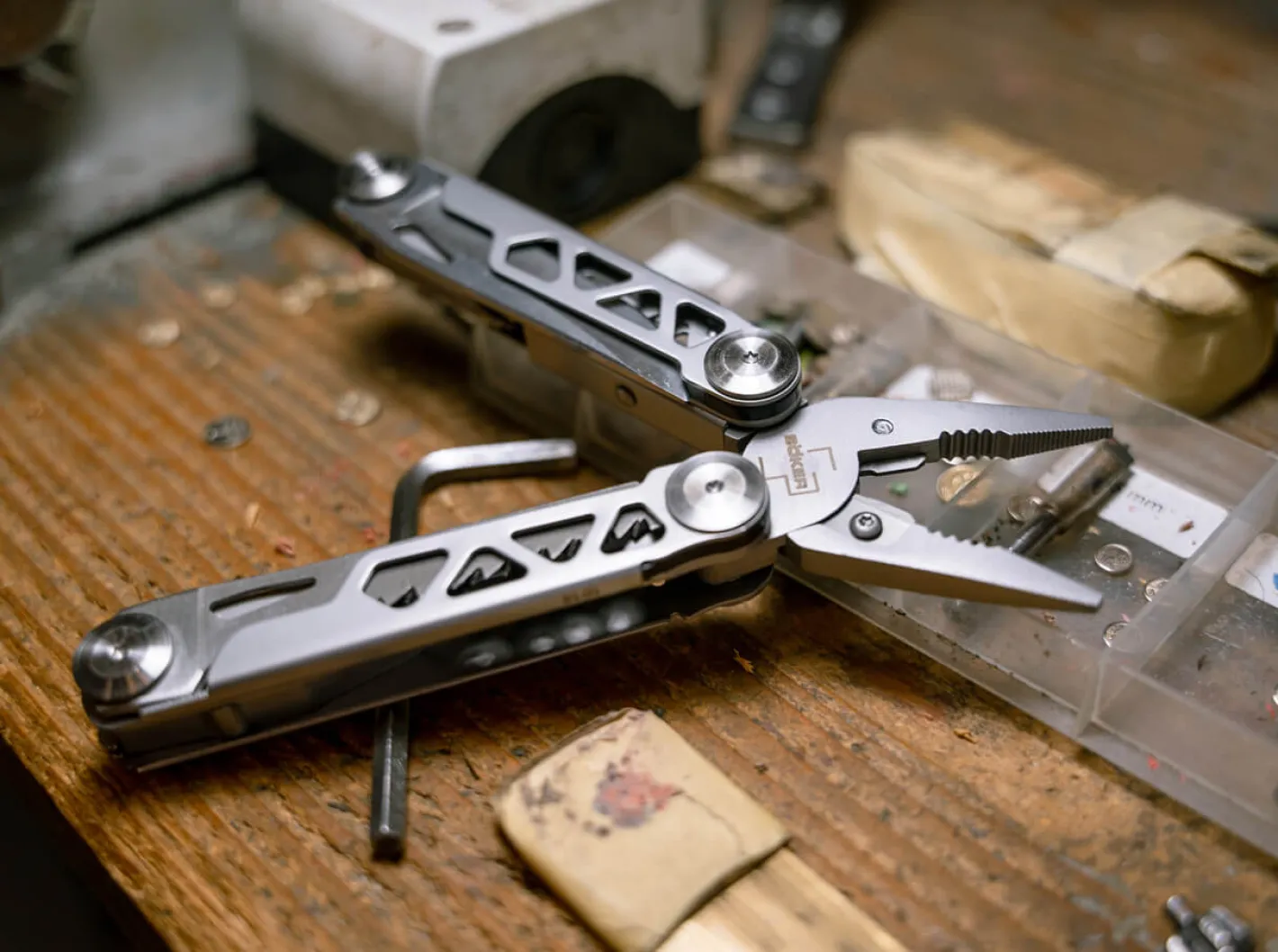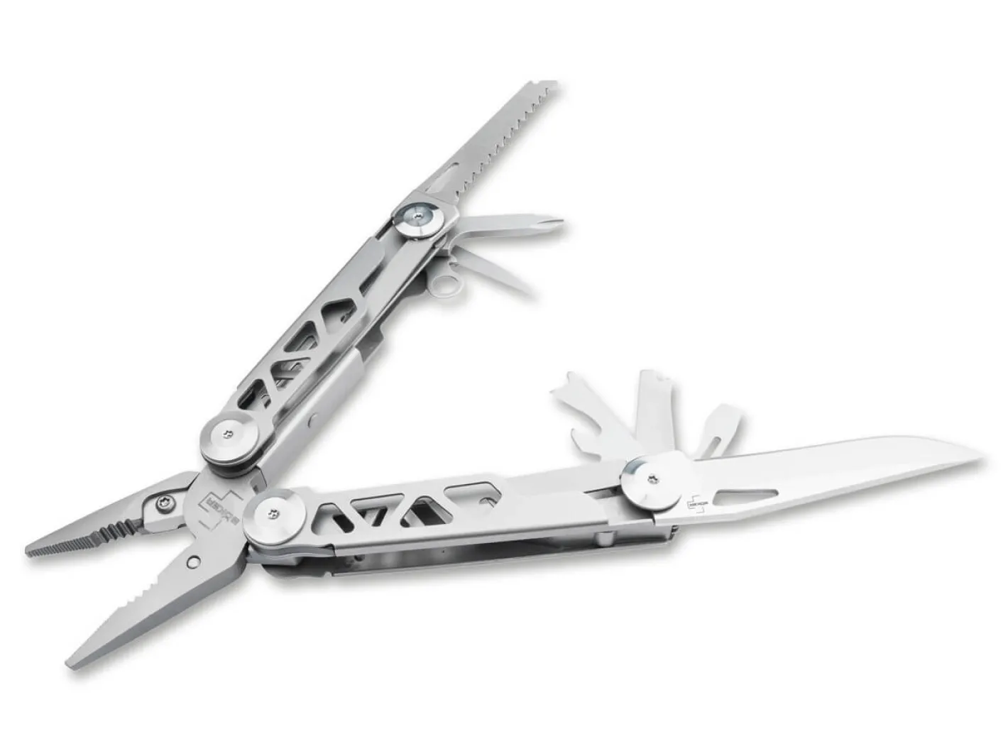 Das mit verschiedenen praktischen Werkzeugen ausgestattete Böker Plus Specialist Pro ist ein vielseitiges Multitool mit federunterstützter Zange. Sie ist mit einem verstärkten, auswechselbaren Drahtschneider versehen und hält auch hohen Belastungen stand. Neben der flachen Greiffläche ist die Zange auch mit einem sogenannten Brennerloch zum Greifen von Außensechskantschrauben, Überwurfmuttern und Rohren ausgestattet. Die in den beiden Griffhälften untergebrachten Werkzeuge lassen sich leichtgängig öffnen und können aufgrund der zuverlässigen Verriegelung besonders sicher eingesetzt werden. Zur Ausstattung des Multitools gehören neben der Kombinationszange auch eine glatte Klinge, eine Holzsäge, ein Dosenöffner, ein Flaschenöffner, ein Drahtbieger/-abisolierer, eine Näh-/Bohrahle, ein Kreuzschlitzschraubendreher, ein Schlitzschraubendreher und eine Metallfeile. Der Griffkörper aus Edelstahl ist mit dekorativen Aussparungen versehen. Mit Fangriemenöse, Clip und hochwertigem Nylon-Gürteletui.