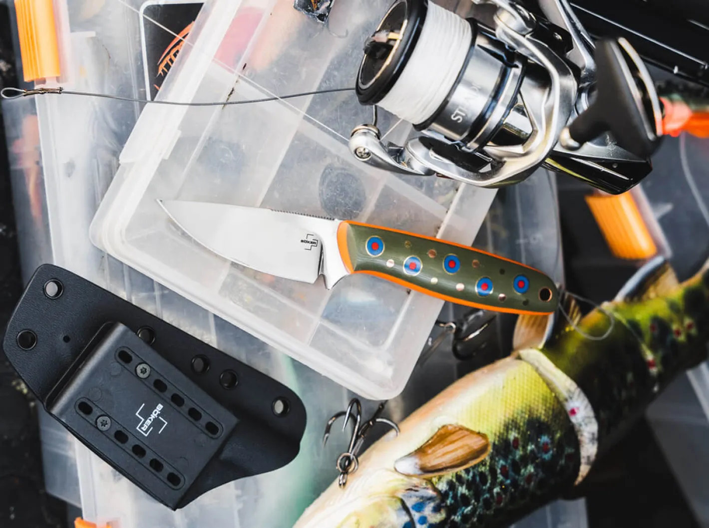 Das außergewöhnliche Böker Plus The Brook ist ein zuverlässiges Jagd- und Outdoormesser, das sich nicht nur aufgrund seiner optischen Ähnlichkeit zu den farbenfrohen Bachsaiblingen heimischer Gewässer als ideales Anglermesser anbietet. Das von Joe Mangiafico aus Oregon entworfene Messer ist mit einer polierten Klinge aus VG-10 und einem Griff aus G10 ausgestattet, dessen verspielte Farbgebung von den bunten Schuppen der weit verbreiteten Lachsfische inspiriert wurde. Der leidenschaftliche Fliegenfischer angelt seit seiner frühesten Kindheit in den Bächen und Flüssen Nordamerikas und begeistert sich seit seiner Zeit am College für das Entwerfen und Fertigen von Messern. Dank Fangriemenöse, Gürteladapter und passgenauer Kydex-Scheide ist das The Brook stets griffbereit.