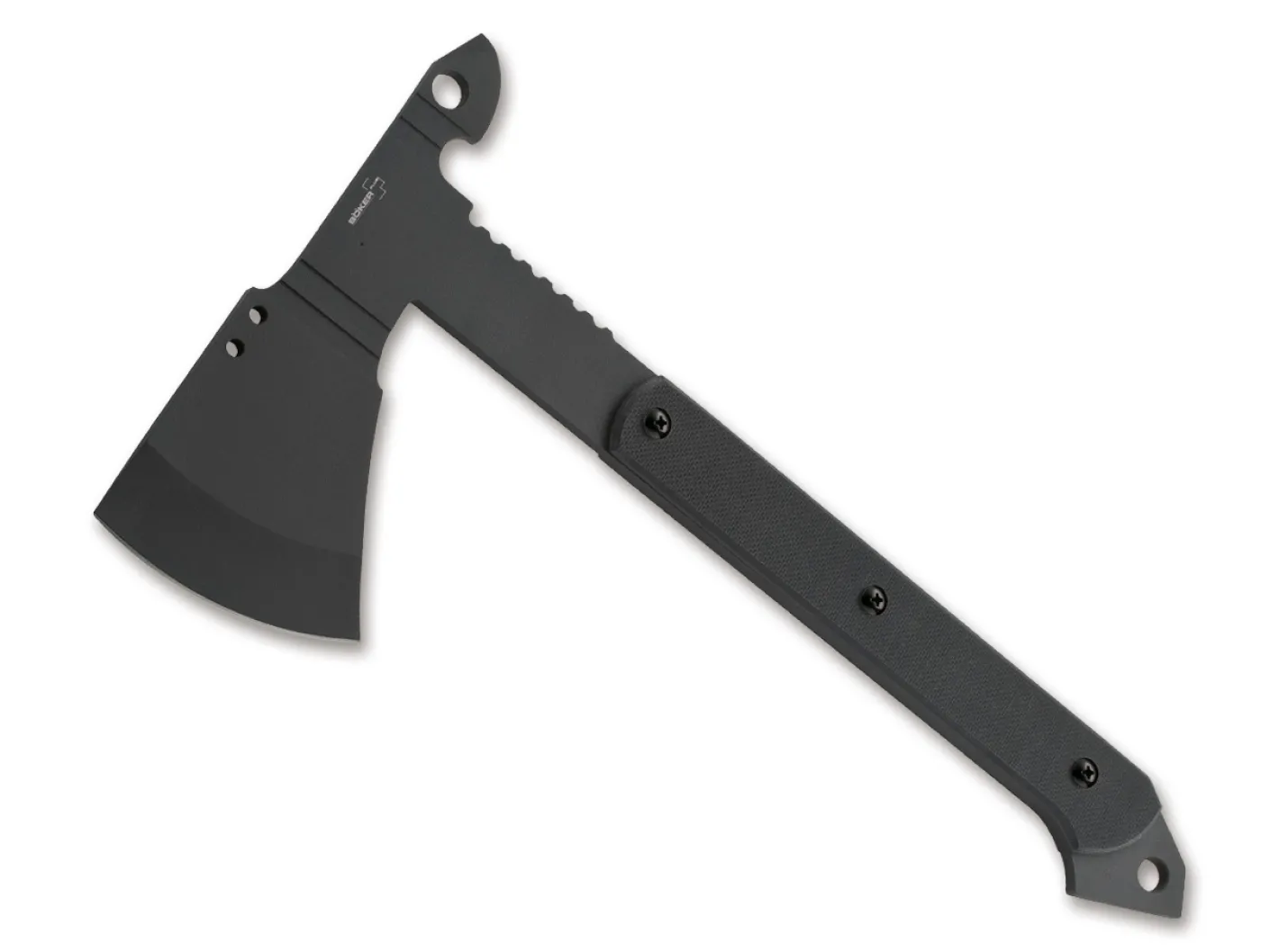 Jesper Voxnæs ist nicht nur für seine ausgeklügelten Messerentwürfe bekannt, auch im Bereich der Tomahawks hat er bereits einige Entwürfe verwirklicht. Das Böker Plus Vox T-Hawk zeichnet sich durch die gewohnte Vielseitigkeit und Funktionalität aus. Die robuste Konstruktion besteht aus einem Stück SK5 Kohlenstoffstahl, der zum Schutz vor Korrosion mit einer widerstandsfähigen Pulverbeschichtung versehen ist. Die Schneide ist für eine hohe Schärfe hohlgeschliffen und lässt sich sehr vielseitig einsetzen. Die G10-Beschalung ist dreifach verschraubt und lässt sich problemlos entfernen. Alternativ lässt sich eine Griffwicklung aus Paracord anbringen, die in passender Länge in oliv und in orange im Lieferumfang enthalten ist. Aussparungen im Erl reduzieren das Gewicht und erleichtern die Anbringung der Wicklung. Ein faszinierendes Werkzeug, das sich durch sein einzigartiges Design deutlich vom bisherigen Angebot abhebt. Lieferung mit Nylonscheide.