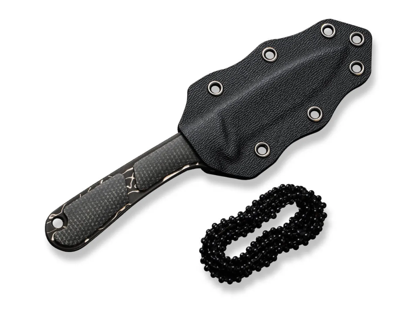 Das beliebte CIVIVI Elementum macht auch als feststehendes Messer in kompakter Neck Knife Größe eine gute Figur und ist im Alltags- sowie Outdoor-Einsatz voll in seinem Element. Die Klinge aus edlem Damast ist mit einer Riffelung auf dem Klingenrücken versehen und verspricht dadurch sicheren Halt bei schwierigen Schneidarbeiten. Der grüne Griff aus Micarta verleiht dem Messer eine schlanke Line und ist Fangriemenöse versehen. Mit Kydexscheide und Kugelkette.