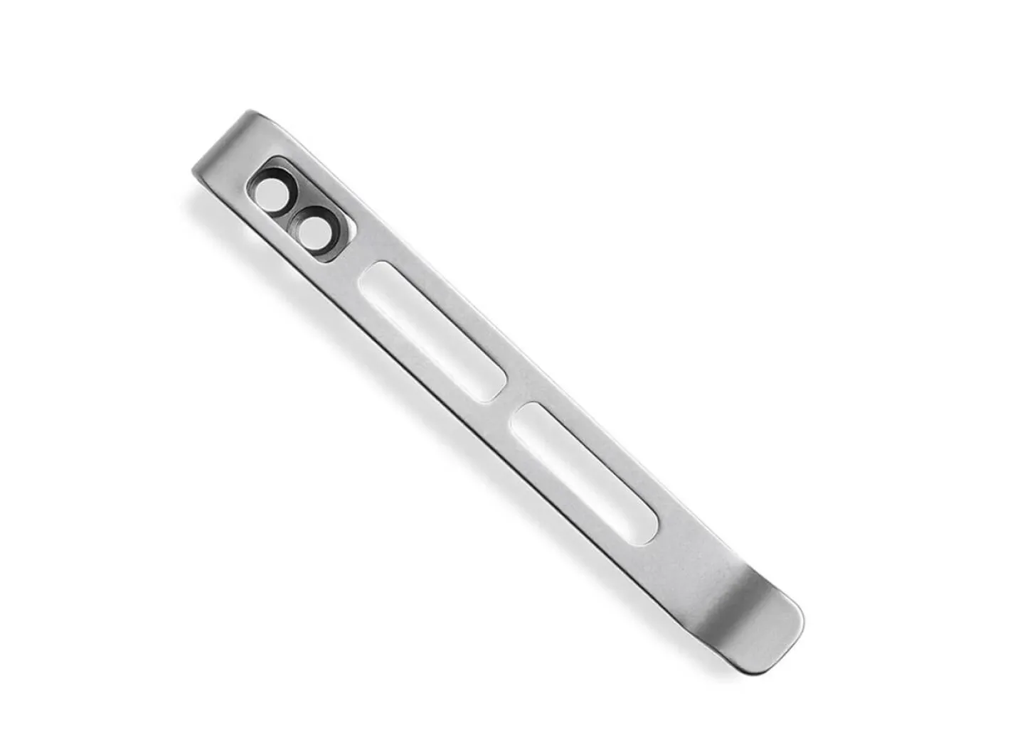 Taschenclip aus Edelstahl mit versenkten Schraubenlöchern und zwei Aussparungen. Schrauben nicht im Lieferumfang enthalten.