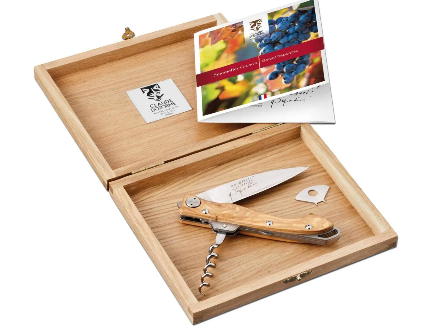 In Zusammenarbeit mit der Manufaktur Claude Dozorme aus Thiers hat der bekannte französische Schauspieler und passionierte Weinkenner ein innovatives und hochwertiges Sommelier Messer entwickelt. Als Basismodell wurde das Messer Capucin gewählt, dessen Griffende an die Form der Kopfbedeckung der Kapuzinermönche erinnert. Es war Gérard Depardieu wichtig, dass das Messer mit einer Klinge in ordentlicher Größe und mit regulierbarer Klingenachsschraube ausgestattet wird. Der Korkenzieher ist sehr stabil konzipiert und hat auch die notwendige Länge, so dass auf einen ausklappbaren Hebel zum Entkorken der Flasche verzichtet werden kann. Als Griffschalenmaterial hat Gerard Dépardieu schön gemasertes Olivenholz ausgewählt, das besonders angenehm in der Hand liegt. Die 10,2 cm lange Klinge mit der 9,5 cm langen Schneide ist aus hochwertigem X50CRMOV15 Stahl gefertigt, besitzt ein satiniertes Finish und arretiert zuverlässig durch eine Linerlock-Verriegelung. Auf der Klinge befindet sich die per Laser gravierte Original-Unterschrift von Gérard Depardieu sowie sein handschriftlicher Gruß „Bon Appetit et santé!“ Im Lieferumfang enthalten sind ein Schlüssel zur Einstellung des Klingenganges sowie eine Messerkette samt Karabiner. Geliefert wird das Sommelier Capucin Gérard Depardieu in einer schönen Holzkassette.
