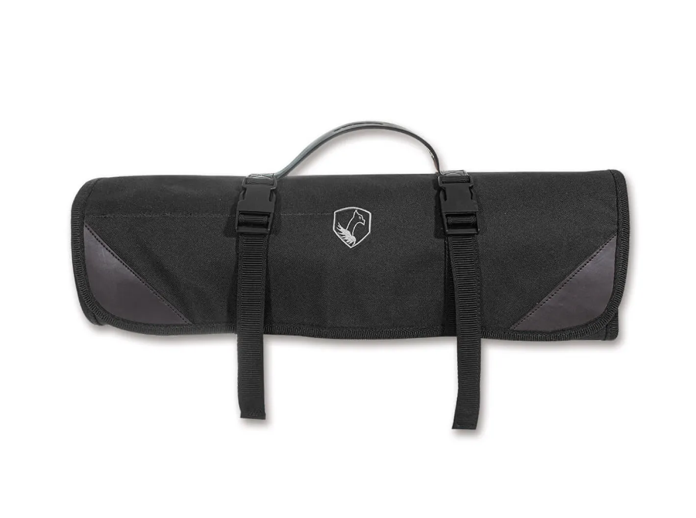 Rolltasche aus schwarzem, widerstandsfähigem Canvas zum sicheren Transport von bis zu 6 feststehenden Messern. Dank verstellbarem Clipverschluss sind die Messer immer sicher und feste verstaut, während die weiche Innenseite aus Leder materialschonend vor Kratzern schützt.