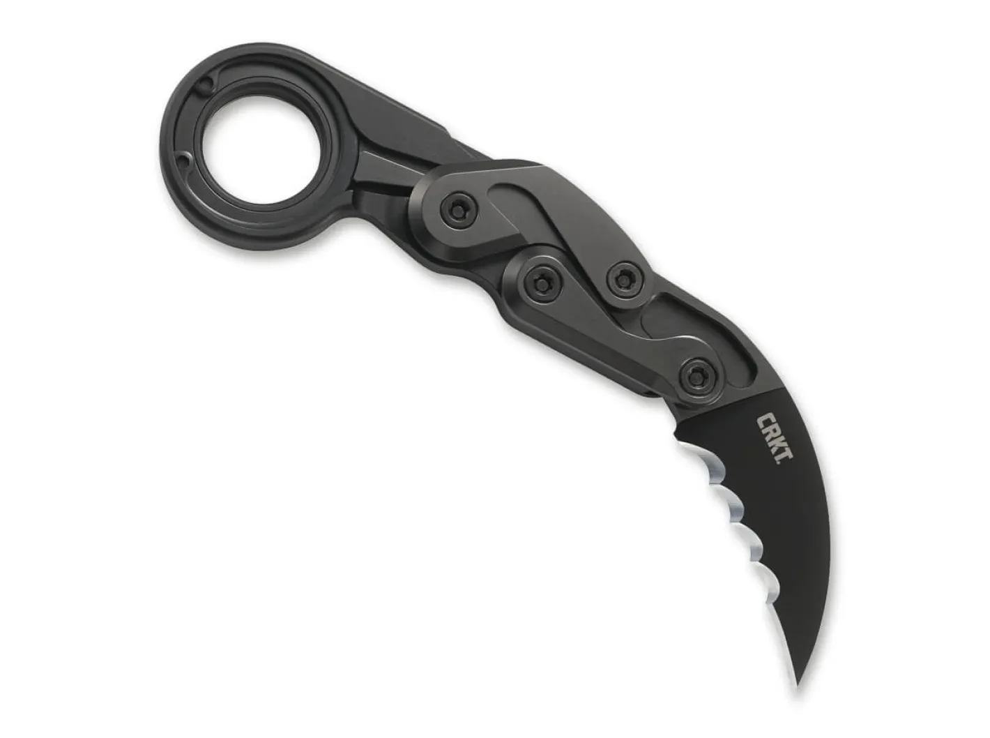 Eine ganz neue Dimension von Klappmesser stellt das CRKT Provoke von Joe Caswell dar, dessen Kinematic genannter Mechanismus mit dem keines anderen Taschenmessers vergleichbar ist. Die auf zwei beweglichen Armen gelagerte Hawkbill-Klinge dreht sich nicht klassisch um eine Achse, sondern wird vom Griff parallel nach vorne herausgeschwenkt und verriegelt. Die Verriegelung des Kerambits wird mit dem in Griff eingelassenen Hebel wieder gelöst. Die Bedienung ist so unkompliziert und intuitiv, dass stets ein sicheres und schnelles Handling gewährleistet ist.Die Griffelemente werden aus 6061 T6-Aluminium gefertigt, während die titannitridbeschichtete Klinge mit Teilwellenschliff aus D2 besteht und beeindruckende 5,3 Millimeter stark ist. Der runde Clip trägt im Gebrauch des Messer nicht auf, lässt sich jedoch mit leichtem Fingerdruck aus seiner Parkposition holen, um das Messer wegzustecken. Das einzigartige Konzept des Provoke beweist anschaulich, dass auch im Bereich der Klappmesser noch grundlegende Innovationen möglich sind.