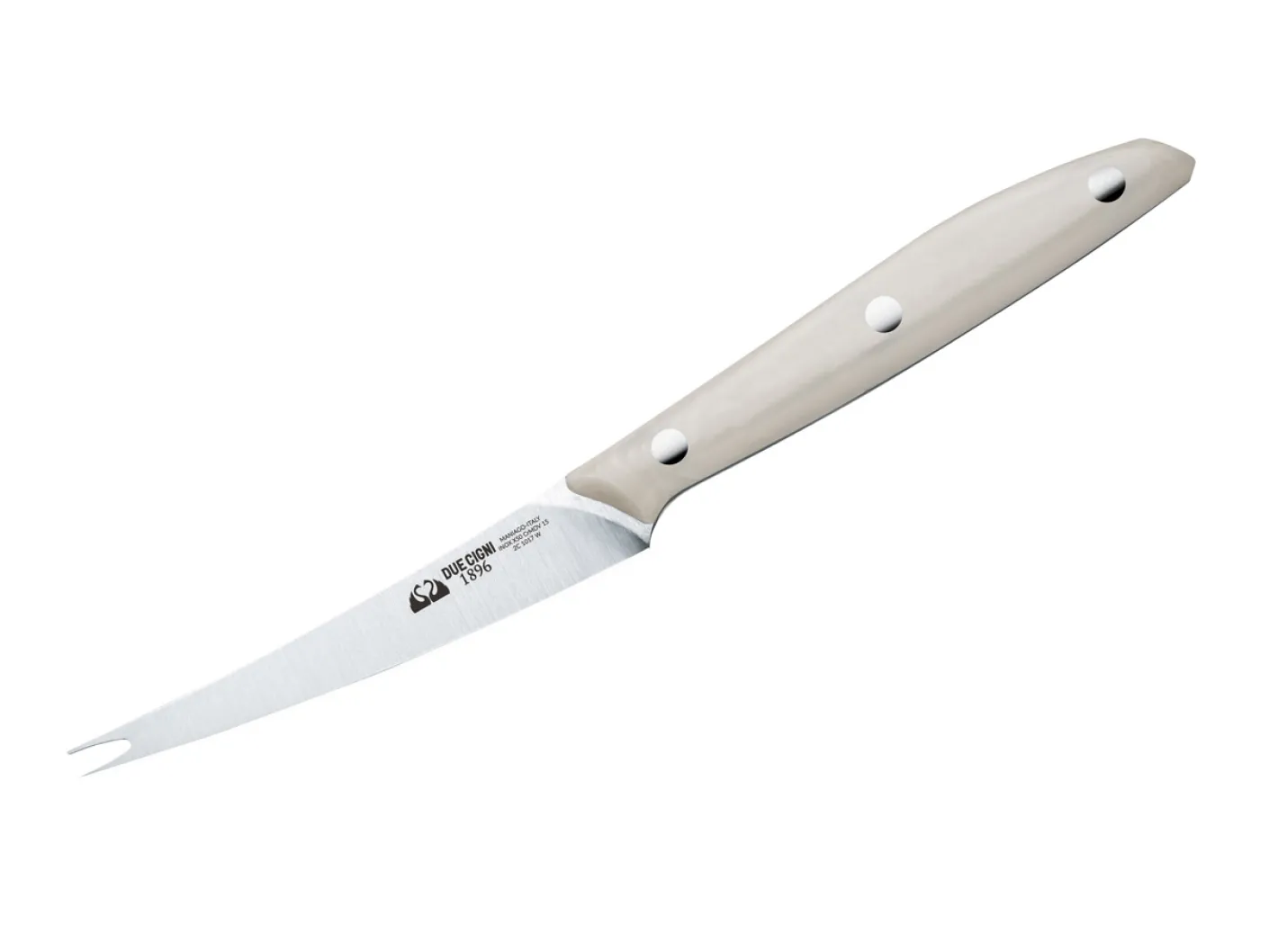 Mit der Serie 1896 stellt Due Cigni eine besonders hochwertige Küchenmesserserie vor, die das Sortiment des Herstellers aus der traditionellen Messerstadt Maniago krönt. Mit Griffen aus widerstandsfähigem weißem POM liegen die Messer ausgezeichnet in der Hand, wobei die klassische Vernietung die optische und haptische Balance perfektioniert. Für die Klinge des klassischen Käsemessers kommt der bewährte X50CrMoV15 zum Einsatz, der Schnitthaltigkeit und Korrosionresistenz perfekt vereint.
