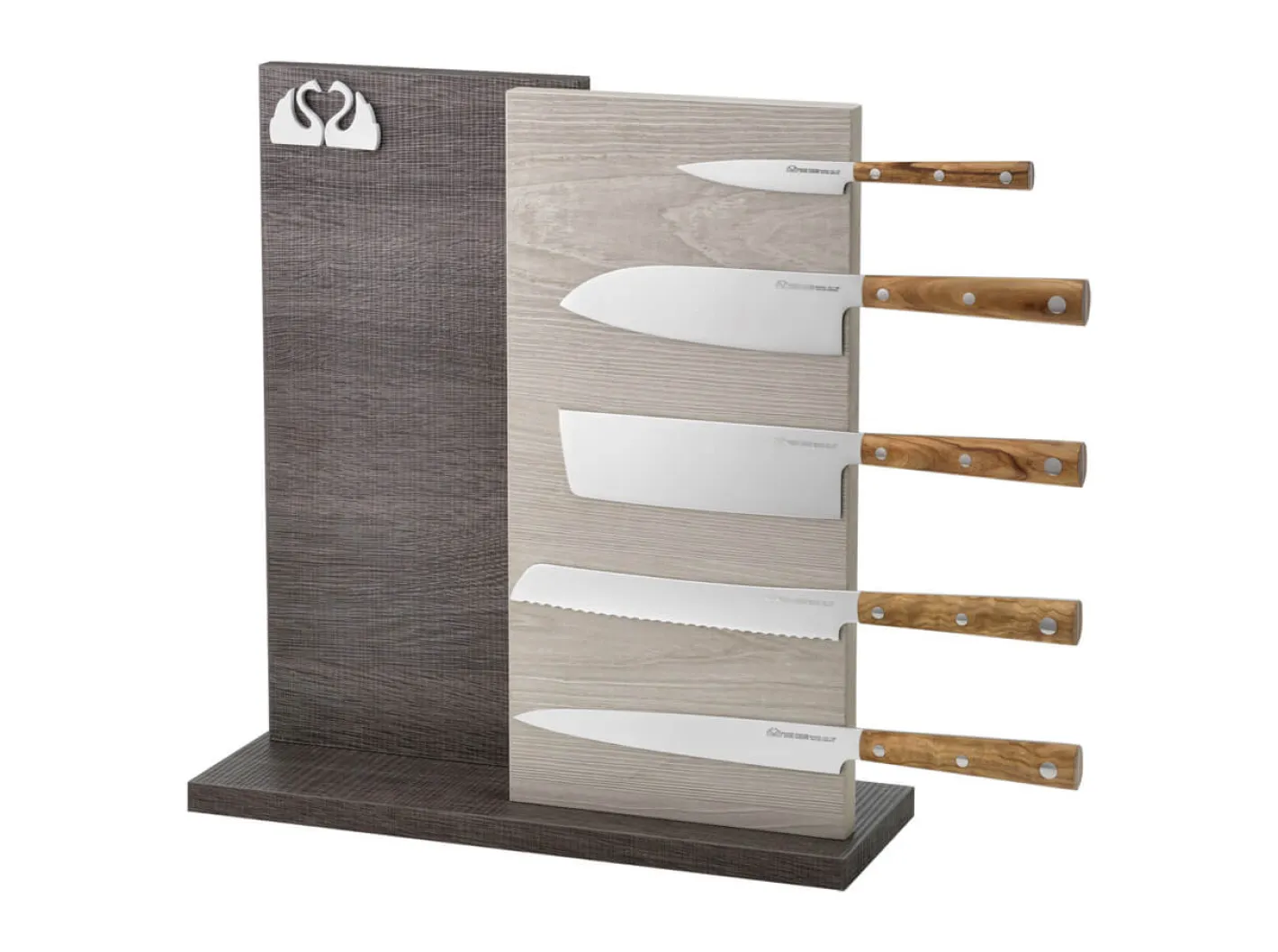 Das magnetische Messerdisplay von Due Cigni wird aus Massivholz gefertigt und kann zur edlen Präsentation von bis zu sechs Kochmessern genutzt werden. Entworfen wurde das Display für die Due Cigni Hakucho Serie, kann aber selbstverstädnlich auch für andere Messer genutzt werden. Auch in der Küche lassen sich die Messer damit modern in Szene setzen.