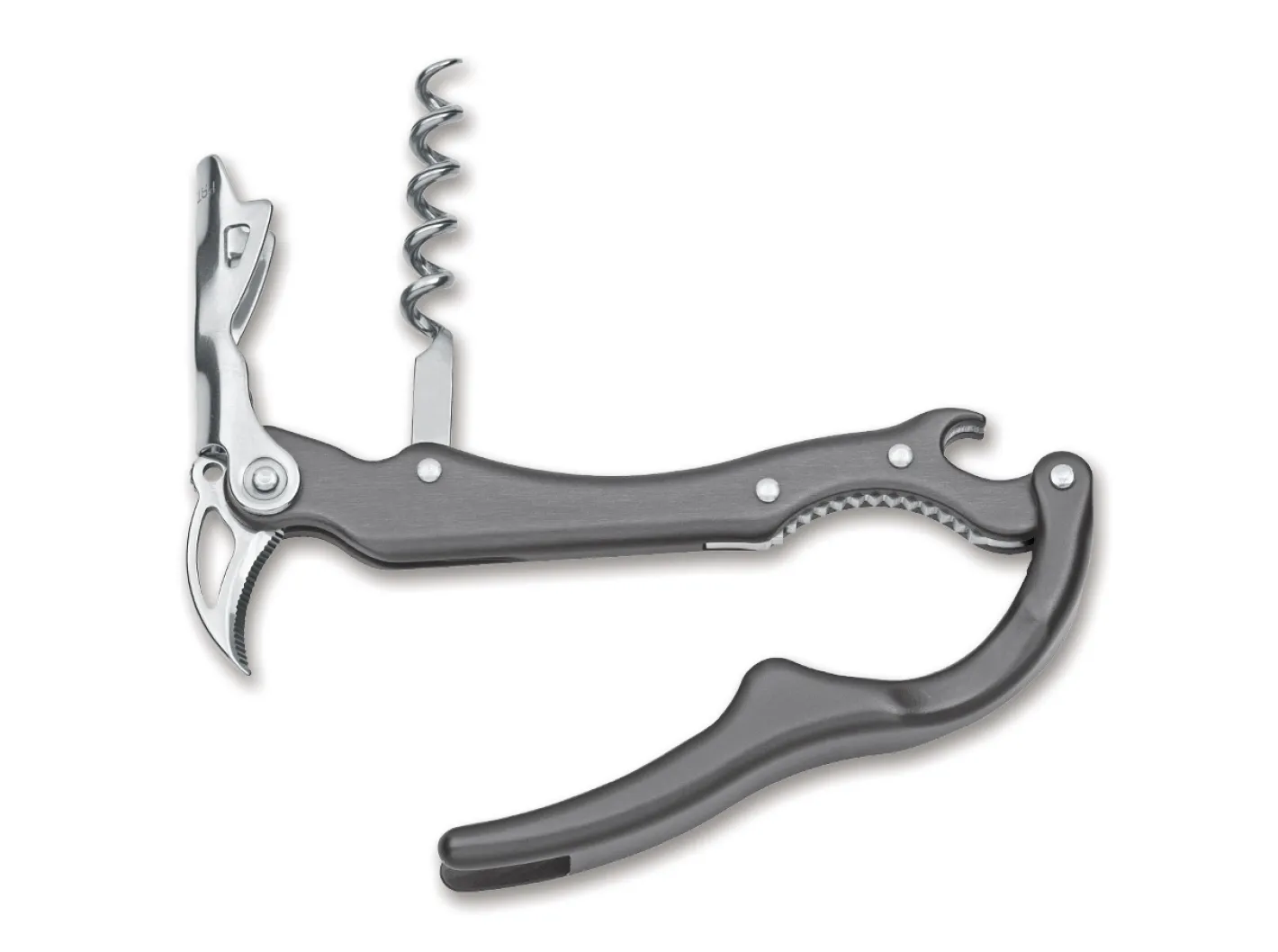 Der MC01 Sommelier-Korkenzieher von Due Cigni ist mit einem ausklappbarem Hebel, einer ausklappbarern Folienklinge, einem Flaschenöffner und einem Greifer für festsitzende Drehverschlüsse ausgestattet. Gefertigt aus Aluminium und Edelstahl.