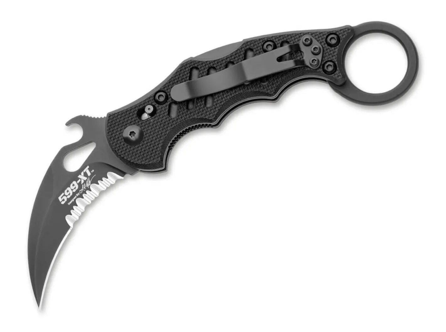 Arbeitsmesser mit Ring am Griffende wurden bereits seit dem 11. Jahrhundert in Südostasien verwendet. Der Ring erlaubt ein freihändiges Arbeiten mit dem Messer, ohne es dabei aus der Hand legen zu müssen und verringert die Verlustgefahr. Die Wellenschliff-Klinge des 599 XTS wird aus N690 gefertigt und ist schwarz beschichtet. Sie wird per Wave-Opener geöffnet und von einem Back Lock arretiert. Eine zusätzliche Verrieglung erhöht zudem die Arbeitssicherheit. Die Griffschalen bestehen aus rutschfestem schwarzen G10. Mit Glasbrecher und umsetzbarem Clip (Tip-up/l-r).
