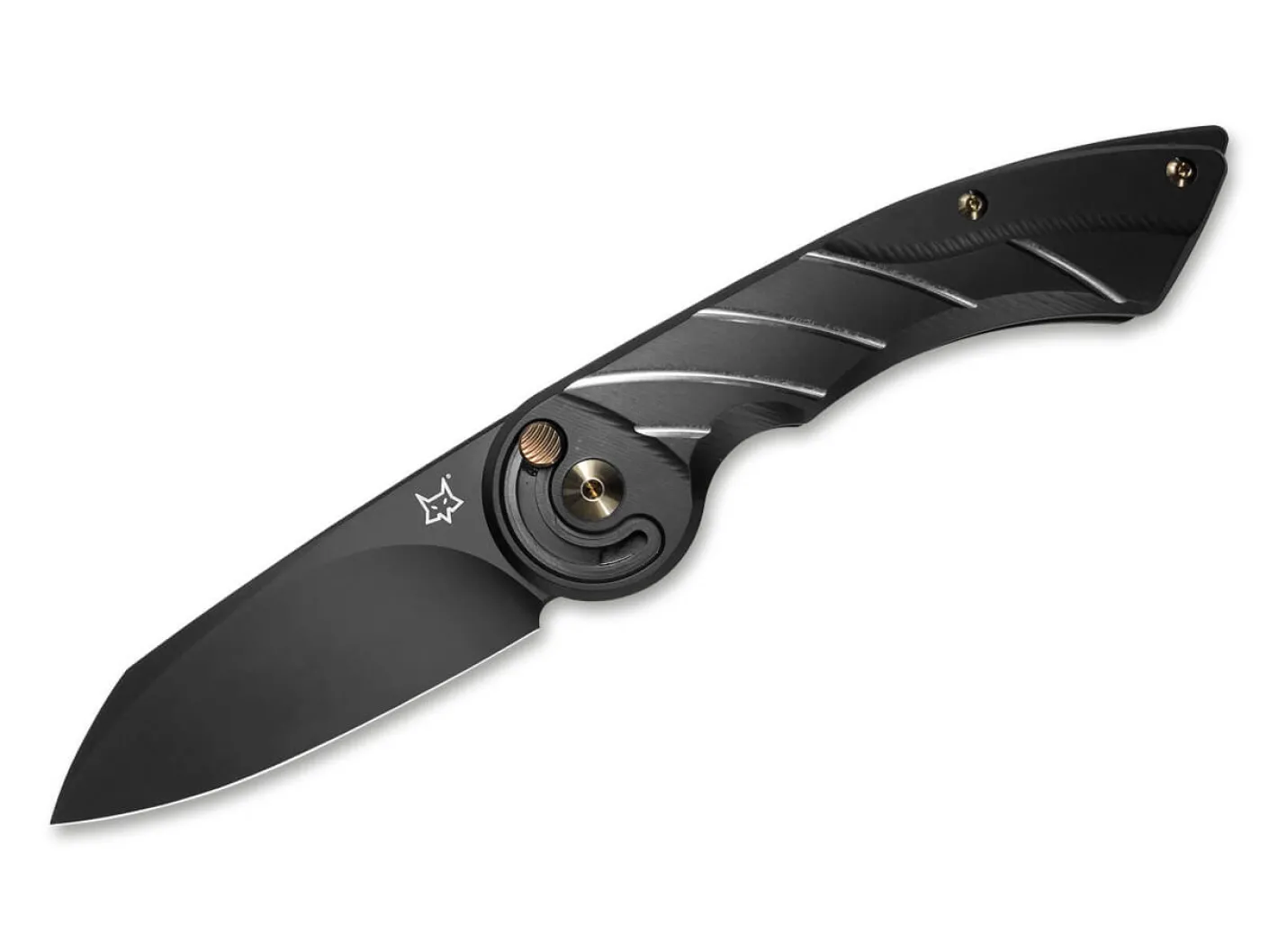 Das innovative Fox Radius ist mit einem neuartigen Öffnungsmechanismus ausgestattet, dem patentiertem Fingers Safe Opening System. Der rotierende Mechanismus wird durch einen in Daumenreichweite angebrachten Knopf betätigt. Durch leichtes Drücken dieses Knopfes und anschließendes Schieben öffnet sich die Klinge und wird zugleich arretiert. Durch eine Rückwärtsrotation wird die Klinge wieder verschlossen. Entworfen wurde das neuartige Taschenmesser von Denis Simonutti, einem jungen Messermacher aus Italien. Es ist mit einer schwarz beschichteten, modifizierten Wharncliffe-Klinge aus M390 und einem ergonomisch gebogenen Griff aus Titan ausgestattet. Mit abnehmbarem Clip (Tip-up).