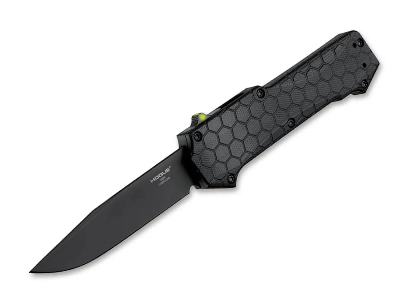 Achtung!Dieser Artikel ist ausschließlich für den Export in zugelassene Märkte bestimmt. Es handelt sich um einen verbotenen Gegenstand gemäß deutschem Waffengesetz. Der Vertrieb in und die Einfuhr nach Deutschland sowie jeglicher Umgang mit diesem Produkt in Deutschland ist verboten. Die Abgabe erfolgt nur an berechtigte Personen, jede Bestellung wird manuell geprüft! Bestellungen aus nicht zugelassenen Märkten werden ohne Rückmeldung gelöscht. Aufgrund der besonderen Rechtslage müssen wir diesen Artikel getrennt von anderen Artikeln versenden, wodurch höhere Portokosten entstehen können.Nahezu in Schallgeschwindigkeit ist das OTF Messer (Out The Front) von Hogue einsatzbereit. Die Besonderheit ist hierbei der mit einem Tritium Marker versehene Druckknopf, der im Dunkeln grün leuchtet und eine noch bessere Handhabe des Automatikmesser bei taktischen Einsätzen ermöglicht. Gewohnt hochwertig ist die pulvermetallurgische Klinge aus CPM-S-30V mit schwarzer PVD Beschichtung. Der texturierte G10 Griff liegt auch bei widrigen Bedingungen perfekt in der Hand. Mit umsetzbarem Clip (Tip-down).