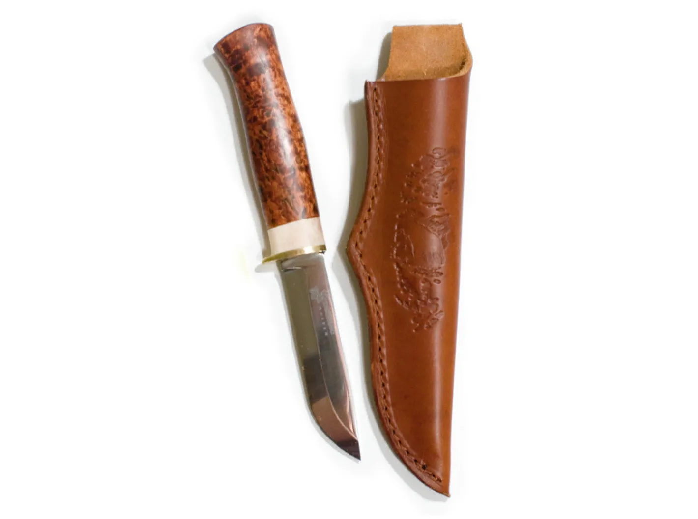 Messergriff aus geölter Maserbirke und Rentierhorn, Klinge 21×100 mm aus rostfreiem Sandvik-Stahl 12C27, gehärtet auf 57HRC. Messerscheide aus 3 mm starkem Rinderleder.