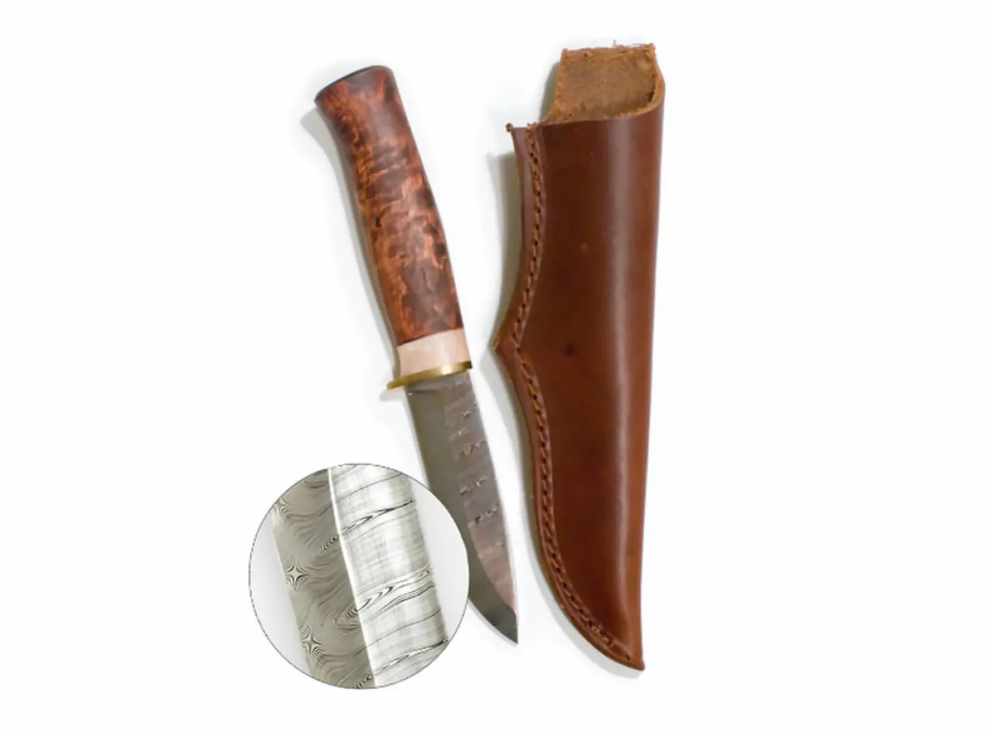 Messergriff aus geölter Maserbirke und Rentierhorn, Klinge 24×100 mm aus martensitisch gehärtetem, rostfreiem Pulverstahl, 120-160 Lagen, gehärtet auf 58HRC. Messerscheide aus 3 mm starkem Rindsleder.