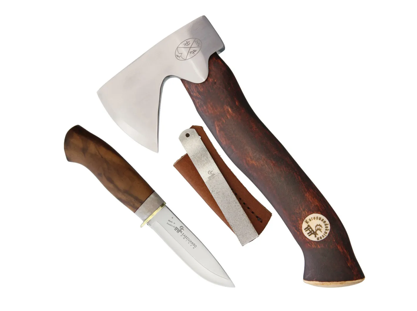 Das komplette Set für die Jagd von Karesuando, bestehend aus einem Jagdmesser und der kleinen Jagdaxt „Unna áksu“ (samisch für „Kleine Axt“), die mit ihren überaus handlichen Abmaßen ein vielseitig einsetzbares Werkzeug ist. Der Kopf aus rostfreiem Stahl ist auf 55 HRC gehärtet. Der Griff aus Walnuss-Wurzelholz besitzt ein eingelegtes Emblem aus Rentierhorn und einen Abschluss aus Elchknochen. Mit hochwertigen Gürtelscheiden aus Leder und einem handlichen Diamantschärfer.