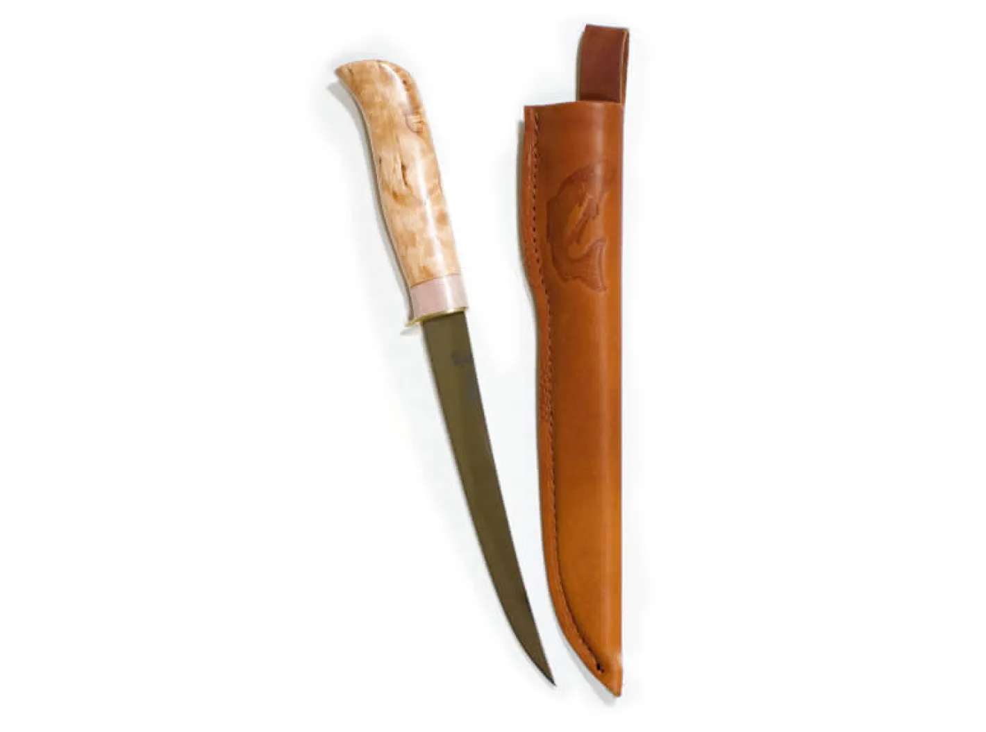 Messergriff aus Maserbirke und Rentierhorn, Klinge 160 mm lang, rostfrei. Messerscheide aus Rinderleder mit Kunststoffeinlage.