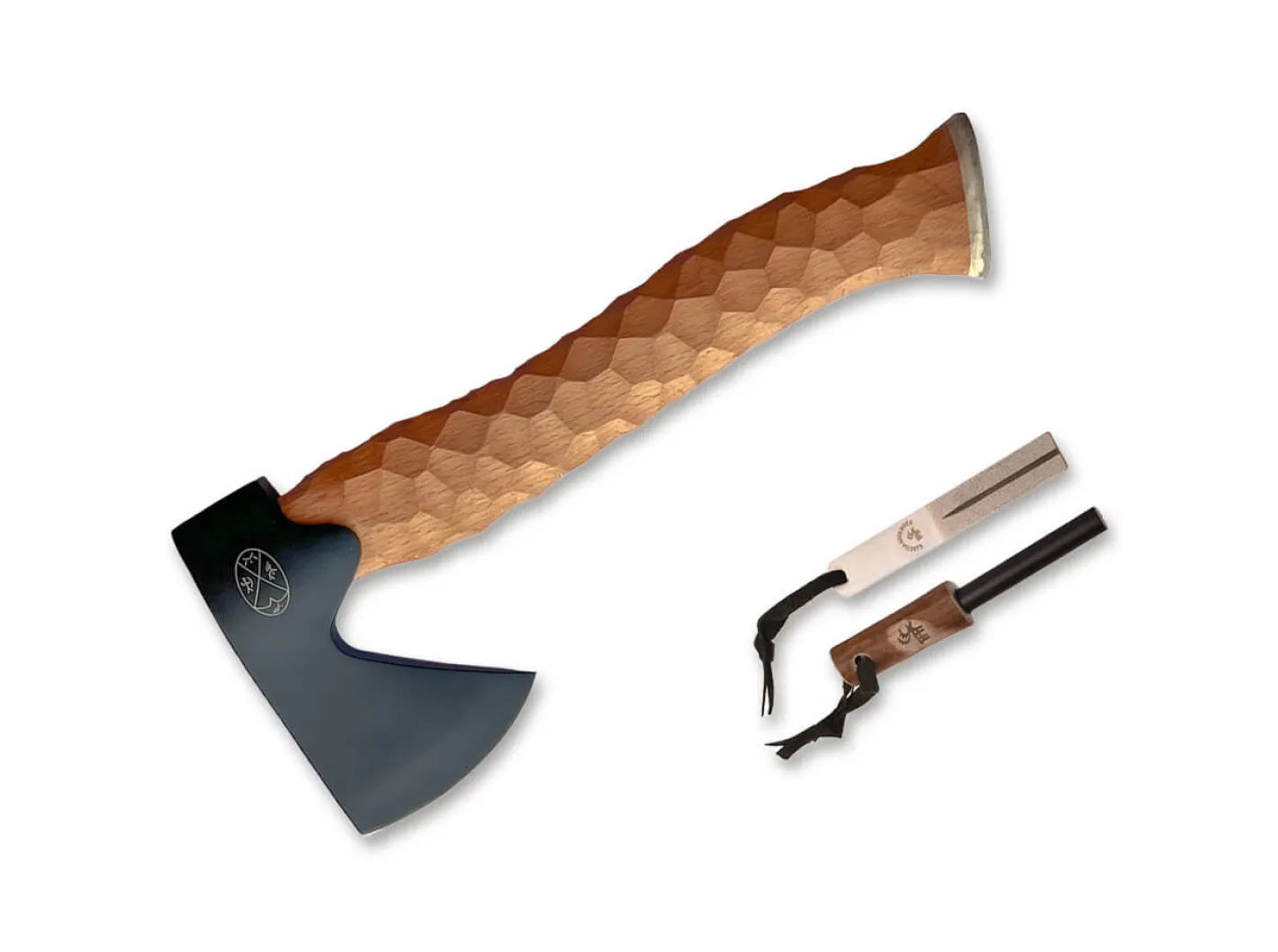 Funktionelles Axt-Set mit robustem Lederholster, Diamantschärfer und Feuerstarter. Die praktische Metsämies High Carbon ist eine Bushcraft-Axt und darf bei keinem Naturabenteuer fehlen. Die rostfreie Klinge aus 5Cr15MoV ist mit einer schwarzen Beschichtung zum Schutz vor Kratzern versehen. Den handgeschnitzten Stiel aus Buche ziert ein Element aus Elch Horn am Griffende.