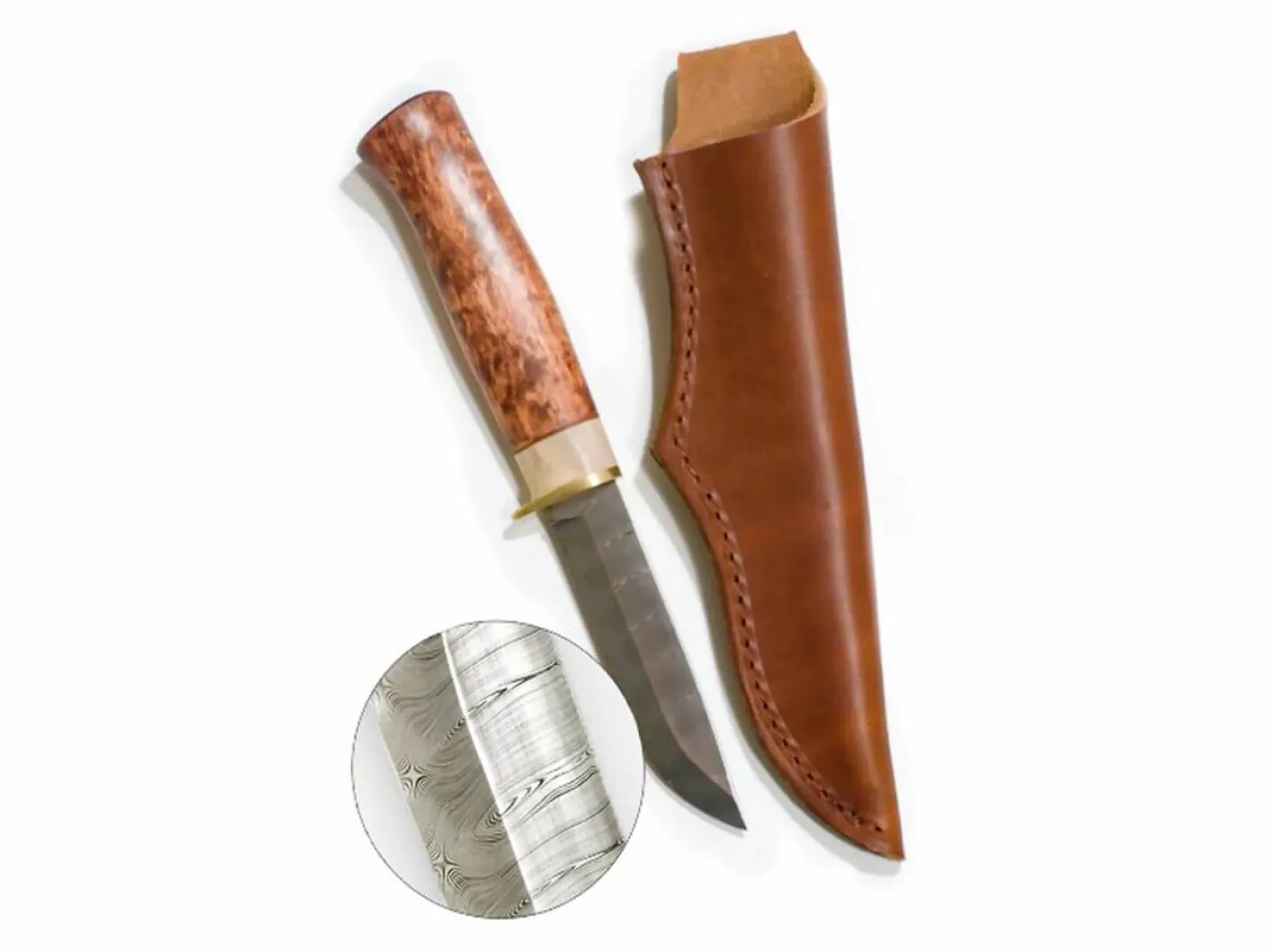Das Ripan besitzt einen aufwändigen Griff aus jeweils zwei Lagen geölter Maserbirke und Rentierhorn. Eine kleine Fingermulde und ein Abschlussstück aus Messing runden das exklusive Erscheinungsbild ab. Traditionelle Lederscheide nach samischer Art mit Lederriemen (ohne Gürtelschlaufe) und Zierprägung. Mit Kunststoffeinsatz. Die Klinge besteht aus hochwertigen Damast Stahl von Damasteel. Lieferung in Holzschatulle mit echtem Rentierfelleinsatz.