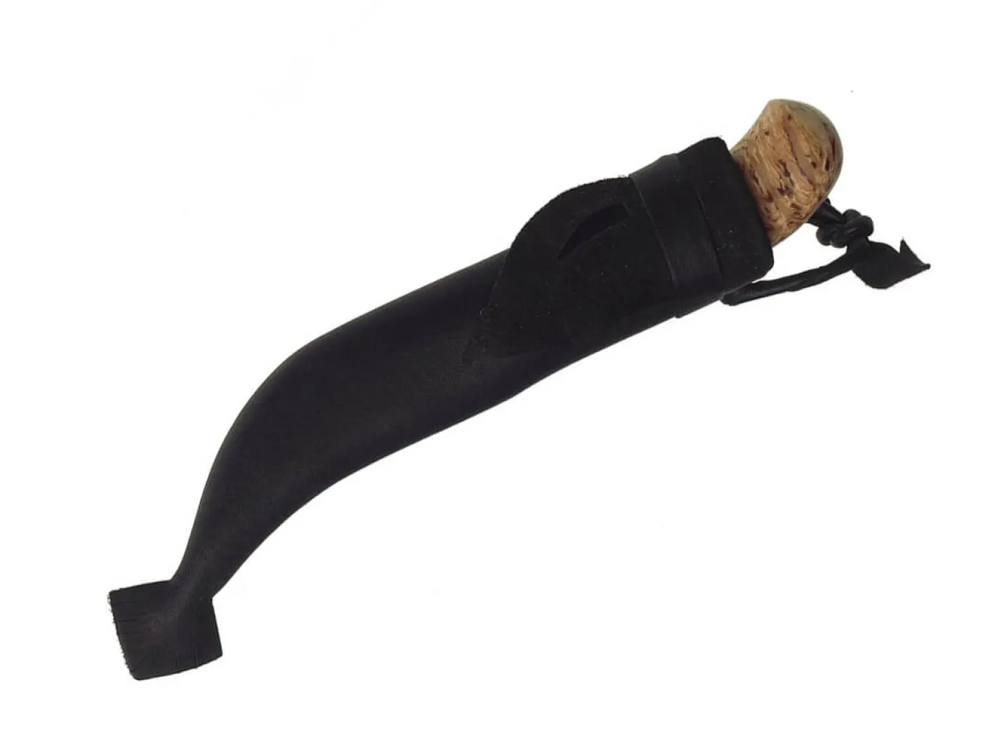 Giron ist der Name eines in Lappland heimischen Vogels, der im Winter ein helles Gefieder bekommt. Und so ist das Karesuando Giron nun mit einem Griff aus heller Maserbirke und Rentierhorn ausgestattet, dessen Knauf den Vogelkopf nachempfindet und für die ausgezeichnete Handlage sorgt. Lieferung mit klassischer samischer Lederscheide mit Durchstichschutz und flexibler Riemenbefestigung.