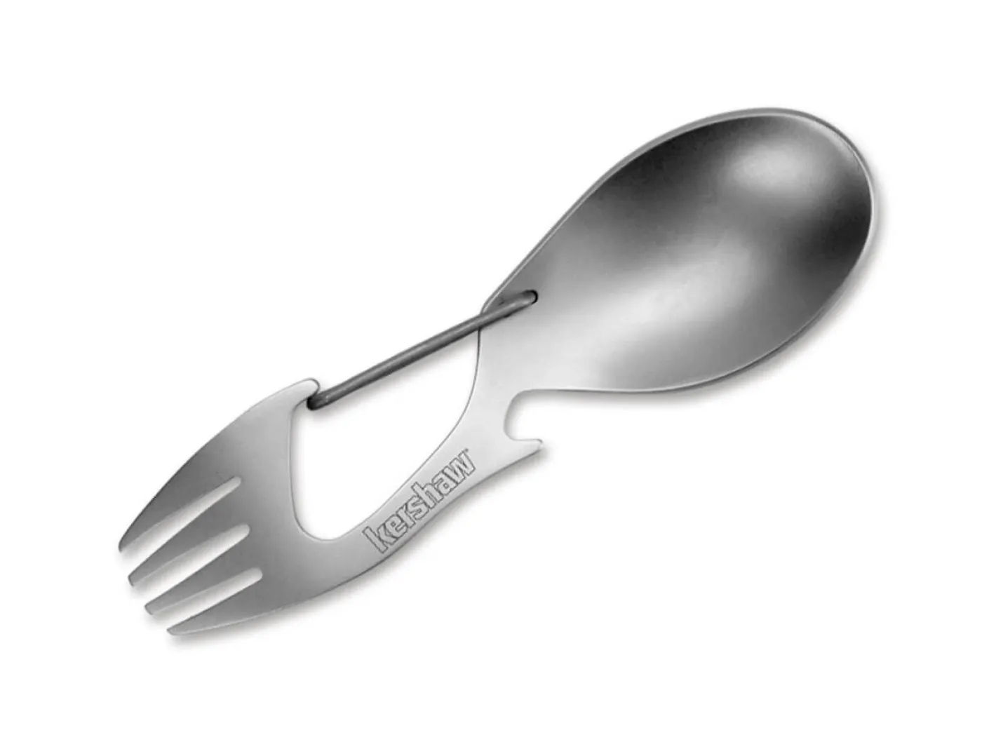 Praktisches Campingbesteck in einer Ration zusammengefasst bestehend aus Gabel, Löffel, Flaschenöffner und Karabinerhaken zur Befestigung am Rucksack. Gefertigt aus 3Cr13 Stahl und einem matten Bead-Blast Finish versehen.