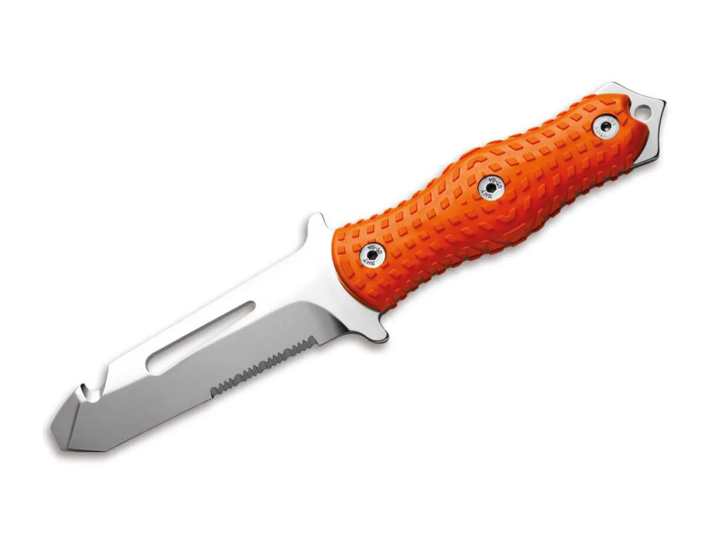 Das Alli Rescue von MAC ist ein kompromissloses Rettungsmesser für den amphibischen Einsatz. Die massive Fulltang-Klinge aus 4116 verfügt über einen scharfen Teilwellenschliff, einen Schnurschneider und eine stumpfe Meißelspitze zum Hebeln. Mit ausgeformtem Schlagstück im Griffende sowie Schäkellöser. Extrem griffige, gummierte Griffschalen. Beidseitig tragbare Nylonscheide mit Gürtelschlaufe und zusätzlichen Beingurten.