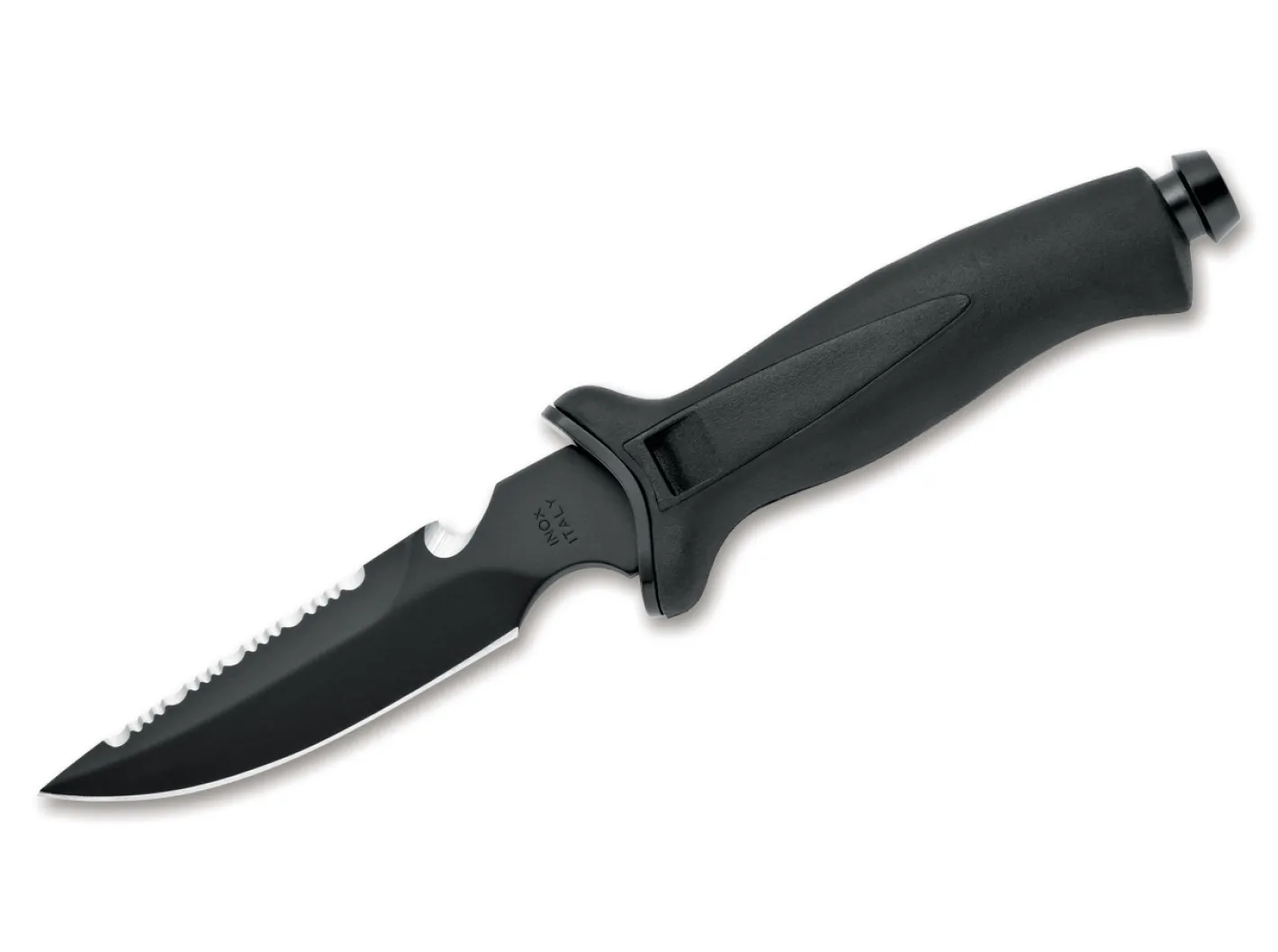 Der gummierter Griff des Aquatys 2 von MAC kommt mit einem Stahl-Schlagstück im Griffende. Die idroglider-beschichtete Klinge aus 4116 ist mit einem Wellenschliff und Schnurschneider am Klingenrücken versehen. Mit beidseitig tragbarer, verriegelbarer Kunststoffscheide mit Beingurten.