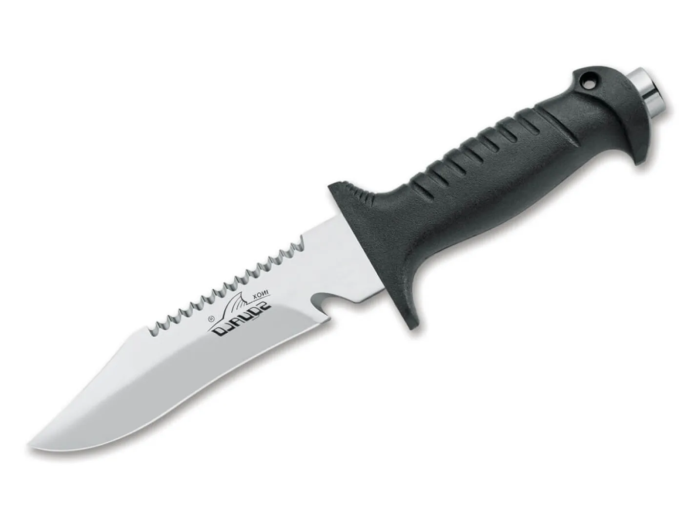 Das professionelle Tauchermesser Squalo 15 MR von MAC ist mit einer Klinge aus 4116 ausgestattet, die zusätzlich über einen bissigen Wellenschliff und einen Gurtschneider verfügt. Der schwarze Griff aus rutschfestem Polypropylen liegt auch unter Wasser sicher in der Hand. Das Schlagstück im Griffende erweitert das Einsatzspektrum. Lieferung mit Polypropylen-Scheide mit Gummibändern für Beine oder Arme.