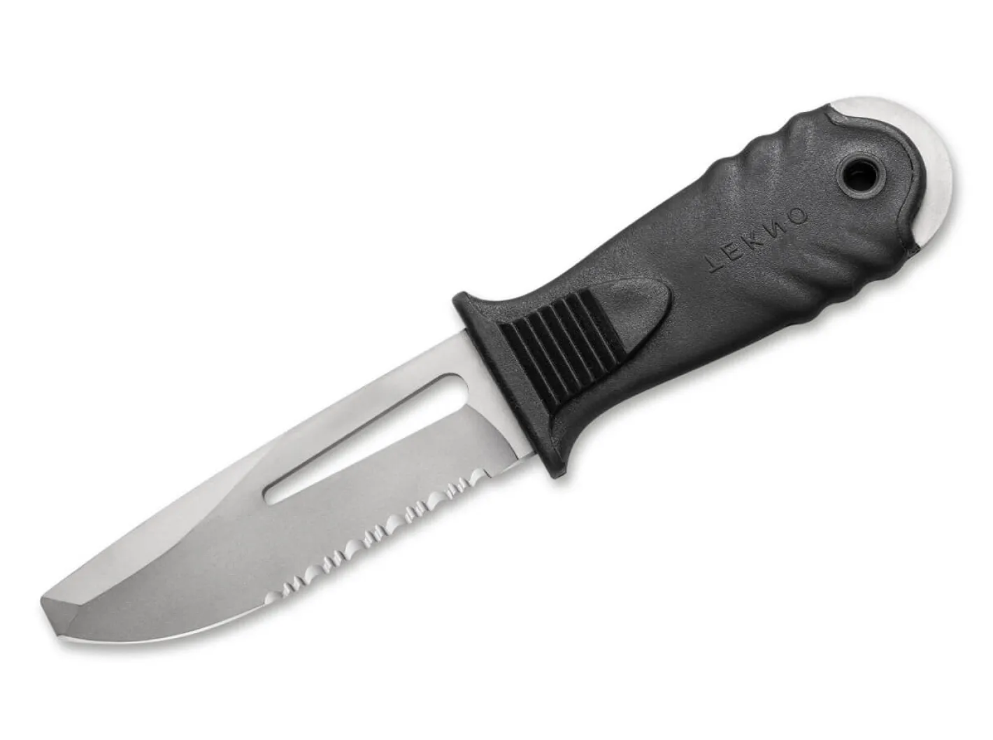 Das professionelle Tauchermesser Tekno von MAC ist mit einer Klinge aus TI6AL4V Titan ausgestattet, die zusätzlich über einen bissigen Wellenschliff verfügt. Der schwarze Griff aus rutschfestem TPE liegt auch unter Wasser sicher in der Hand. Lieferung mit ABS-Scheide mit Gummibändern für Beine oder Arme.