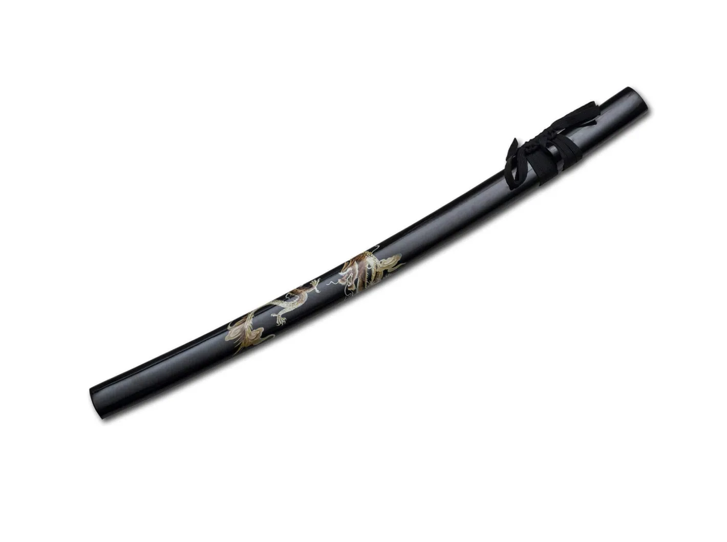 Eine der Neuheiten in unserem Schwerter- Portfolio verfügt über eine dekorativ geschliffene Klinge aus Karbonstahl (nicht rostfrei) und eine traditionelle Tsuba. Ein fliegender Drache ist das Motiv des Stichblatts. Der traditionell anmutende Griff besitzt eine Griffunterlage aus Rochenhaut-Imitat und die typische Griffwicklung. Die Härtelinie (Hamon) ist künstlich aufgebracht. Schwarze Holzscheide mit einem bernsteinfarbenen Drachen. Deko- bzw. Sammlerschwert, nicht zum Einsatz geeignet!Deko- bzw. Sammlerschwert, nicht zum Einsatz geeignet.