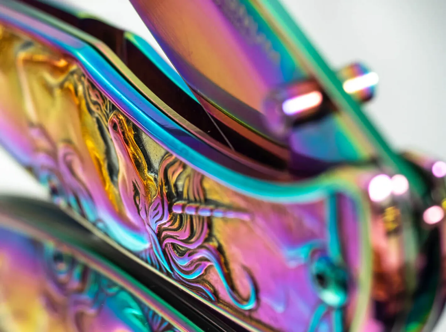 Ob auf prähistorischen Wandmalereien, in der griechischen Antike, den keltischen Volkssagen, dem deutschen Mittelalter, der Renaissance oder bei den Gebrüdern Grimm: Das Einhorn scheint eine Ursehnsucht der Menschen zu sein, deren kindlicher Faszination sie sich auch im Erwachsenenalter ein Leben lang nicht entziehen können. Das Magnum Anna’s Rainbow Unicorn ist ein klassisches Framelock-Taschenmesser mit beidseitigem, demontierbarem Daumenpin. Der märchenhafte Griff aus Edelstahl ist einseitig mit einem stark ausgeprägten Einhorn-Relief ausgestattet. Die farbenfrohe Droppoint-Klinge besteht aus rostfreiem 440A und ist wie auch der Griff mit einem spannenden Rainbow-Finish versehen. Mit Clip (Tip-up/r).
