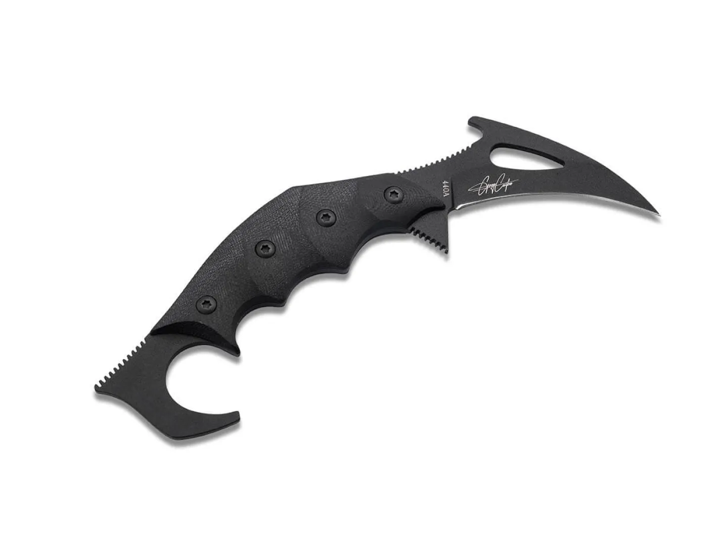 Taktisch effizient und kompromisslos konsequent – Das Magnum Carnifex (dt. Scharfrichter) vom ungarischen Messermacher Gergő Czifra vereint jene prägenden Eigenschaften in diesem komplett in Schwarz gehüllten Karambit, das mühelos Kartons zerschneidet, Taue kappt oder kleinem Astwerk zu Leibe rückt. Die aggressive Hawkbill-Klinge aus 440A ist in Ihrer Form einer Henkermaske nachempfunden und sorgt mit Jimpings an der Daumenauflage für eine bessere Arbeitssicherheit. Weiterhin garantieren die ergonomischen, balligen Griffschalen aus G10 sowie der Vollerl satten Halt bei maximaler Stabilität. Der für ein Karambit typische Ring am Griffende ist halboffen und ermöglicht somit eine flexible Handhabung als Grifferweiterung, Hebel oder Haken. Lieferung mit passgenauer Kydexscheide, die am Gürteladapter um bis zu 90 Grad rotiert werden kann.