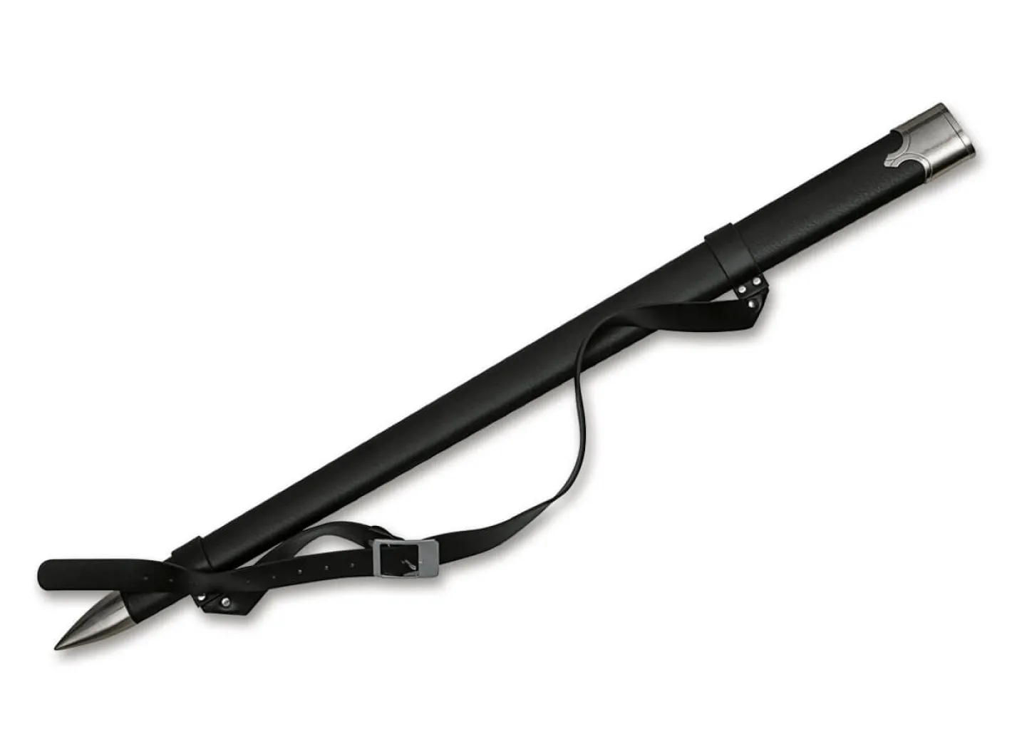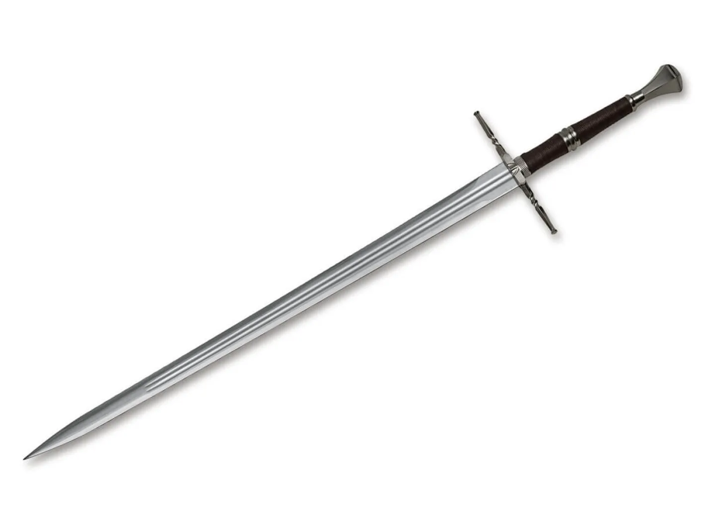 Das monumentale Magnum Ferrum ist ein eindrucksvoller Zweihänder, der von seinem Besitzer insbesondere gegen menschliche Angreifer eingesetzt wird. Das mittelalterliche Schwert wird aus hochwertigem Edelstahl gefertigt, der Griff ist mit dünnem Seil umwickelt. Die dekorativ verzierte Parierstange schützt vor angreifenden Halunken, und auch der massive Knauf kann geschickt eingesetzt werden. Dank der passgenauen Scheide mit verstellbarem Gurt kann das Schwert bequem auf dem Rücken getragen werden.Deko- bzw. Sammlerschwert, nicht zum Einsatz geeignet.Dieser Artikel wird als Sperrgut verschickt.