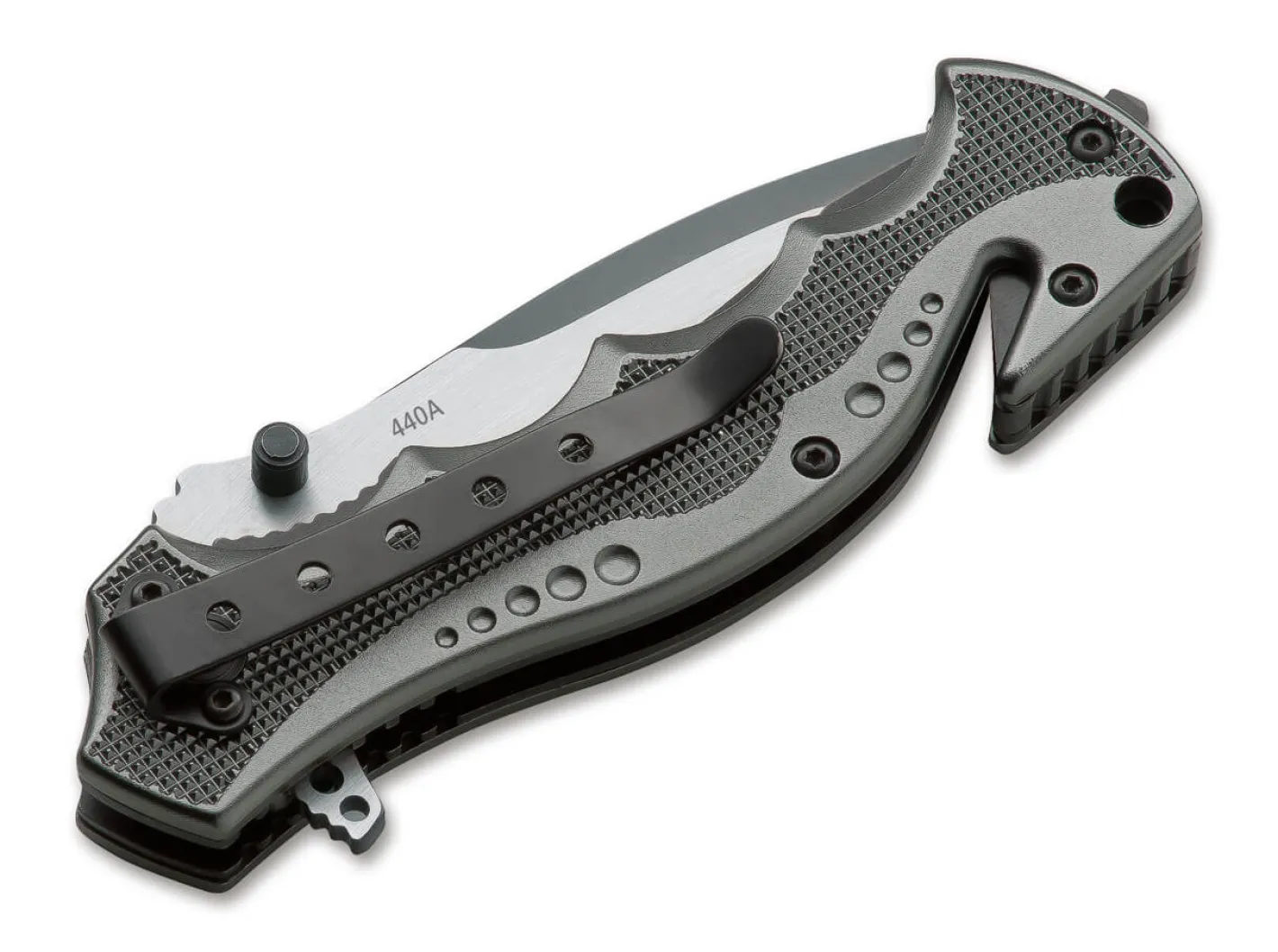 Hinweis: Seit dem 31.10.2024 gilt in Deutschland ein generelles Umgangs- und Besitzverbot von Springmessern aller Art. Es handelt sich ab sofort um verbotene Gegenstände, deren Besitz strafbar ist. Der Besitz von bestimmten Springmessern ist gem. Anlage 2 zum Waffengesetz Abschnitt 1 Nummer 1.4.1 nur noch Personen erlaubt, bei denen ein berechtigtes Interesse besteht, das eine einhändige Nutzung erforderlich macht (etwa aufgrund eines fehlenden Arms oder einer fehlenden bzw. dysfunktionalen Hand), oder der Umgang im Zusammenhang mit der Berufsausübung (z.B. Jagd, Handwerk) oder dem Sport (z.B. Segeln oder Bergsteigen) erfolgt. Gleiches gilt für gewerbliche Händler oder Hersteller solcher Messer. Die Abgabe erfolgt daher nur noch an berechtigte Personen. Bitte prüfen Sie vor der Bestellung, ob ein solches berechtigtes Interesse bei Ihnen vorliegt.Das Magnum Hero spiegelt den Mut und die Professionalität der Spezialisten wider, die bei gefährlichen Polizeieinsätzen ihr Leben aufs Spiel setzen. Die rostfreie Klinge aus 440A ist mit einem attraktiven Two-Tone-Finish versehen und arretiert über den Linerlock. Der anthrazitfarbene Griff ist mit SWAT-Logo versehen und besteht aus leichtigewichtigem, stabilen Aluminium. Der Glasbrecher, der partielle Wellenschliff, der Gurtschneider und der federunterstütze Öffnungsmechanismus stehen für eine hohe Funktionalität. Mit Clip und Fangriemenöse.